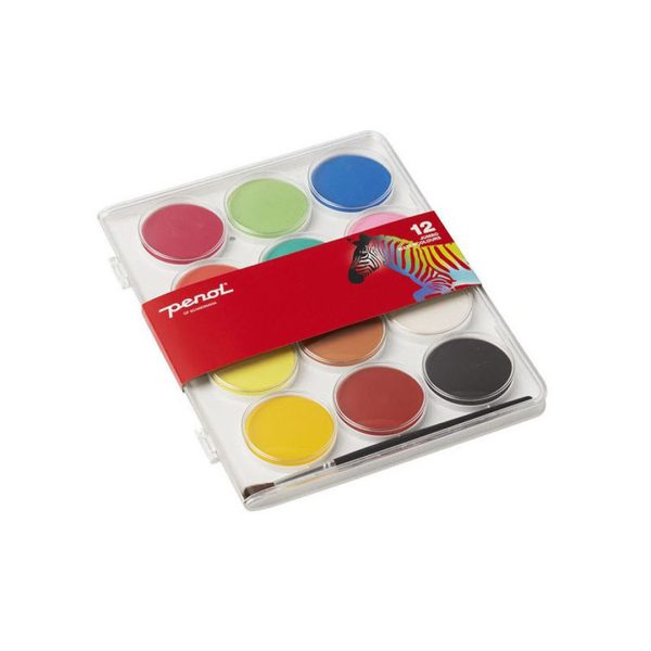 Maleskrin fra Penol med 12 store vannmaling frager og en pensel. Hver farge måler ca 5 cm i diameter. Skrinet måler ca 24 x 19 cm.