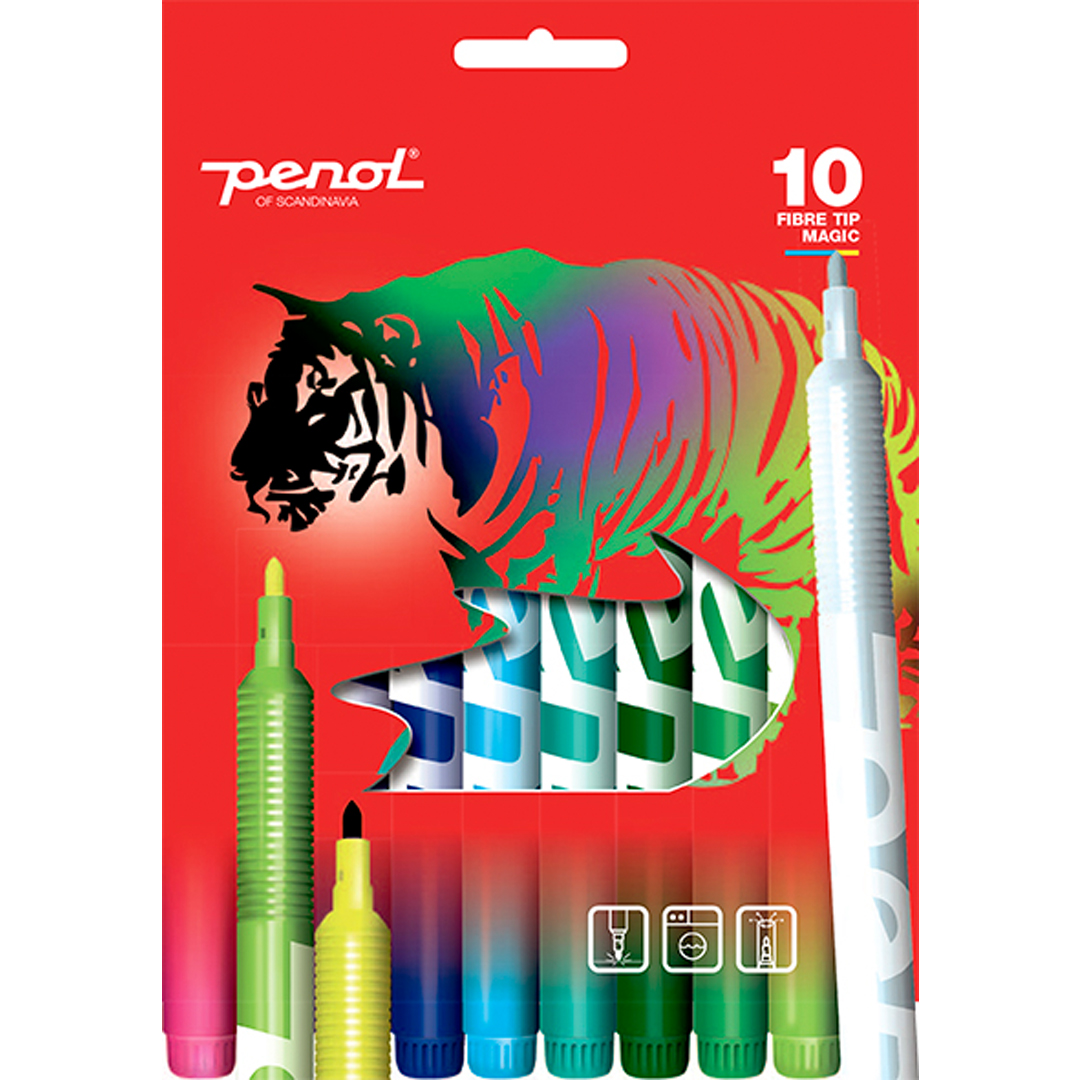 10 tusjer der den ene tusjen endrer fargen til de 9 andre. Alle barnetusjer fra Penol leveres i resirkulerbart materiale – og hylsene er helt fri for PVC. Alle tusjer er CE-merket og overholder alle krav til barnesikkerhet.