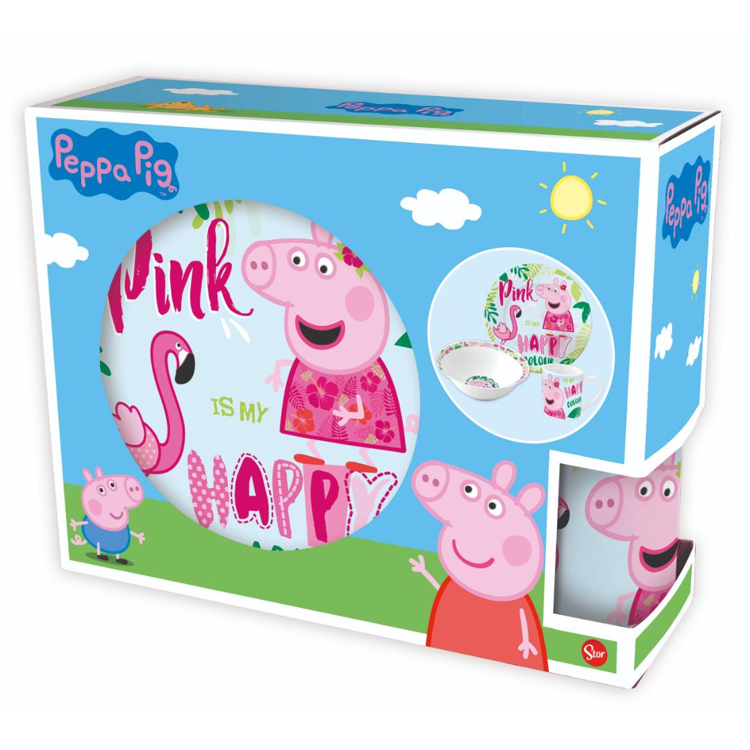 Peppa Pig 3-dels gavesett i keramikk er en fin gave til barn som liker Peppa Gris. Settet består av tallerken, skål og kopp med sommerlig Peppa-motiv der hun har på seg sommerkjole. Keramikken gir en robust følelse og gjør settet godt egnet til både frokost og kveldsmat, samtidig som det gjør måltidene litt mer lekne.