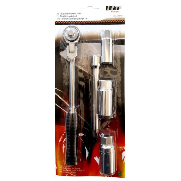 Inneholder 1 stk 3/8″ skralle, 3 stk piper i følgende dimensjoner: 16, 18 og 21 mm og en forlenger på 145 cm.