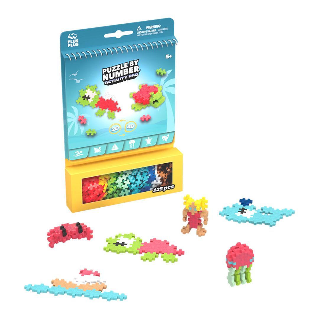Plus-Plus Ocean Activity Pad tar barna med på eventyr under havet. Settet inneholder 125 brikker og 12 aktiviteter som lar barna bygge alt fra skilpadder og krabber til seilbåter og fisker. Et morsomt og lærerikt byggesett som oppmuntrer til kreativ lek og historiefortelling.