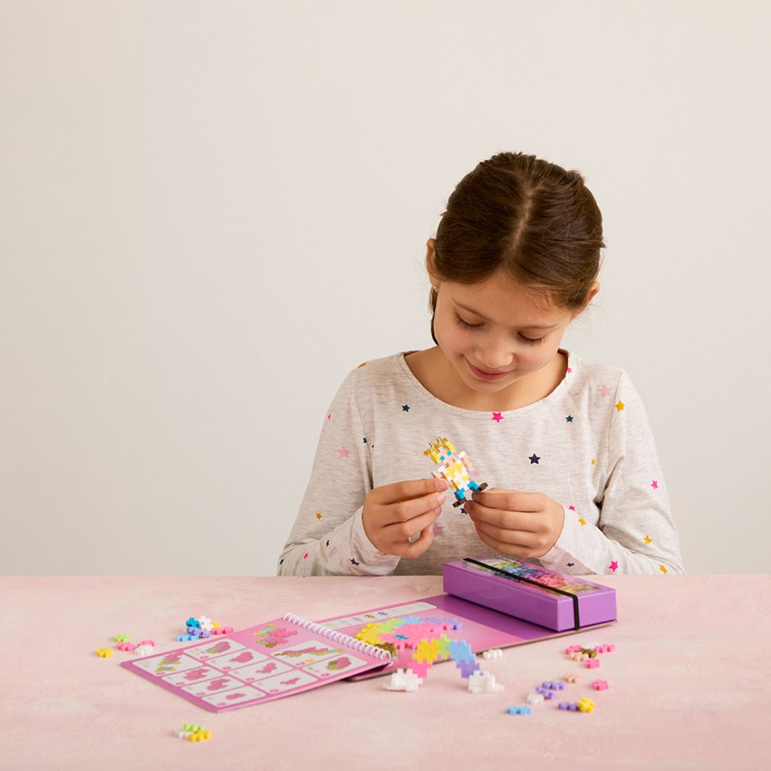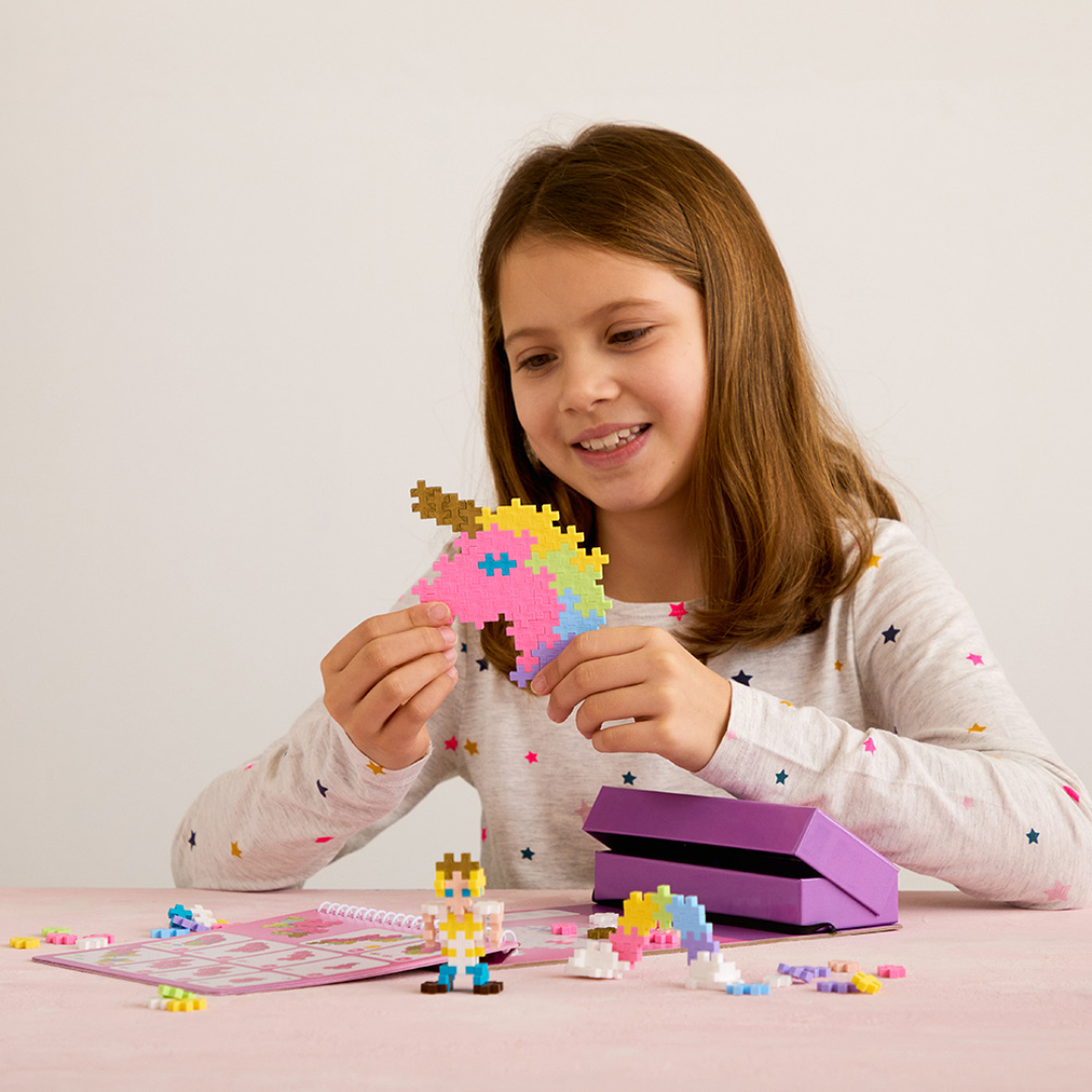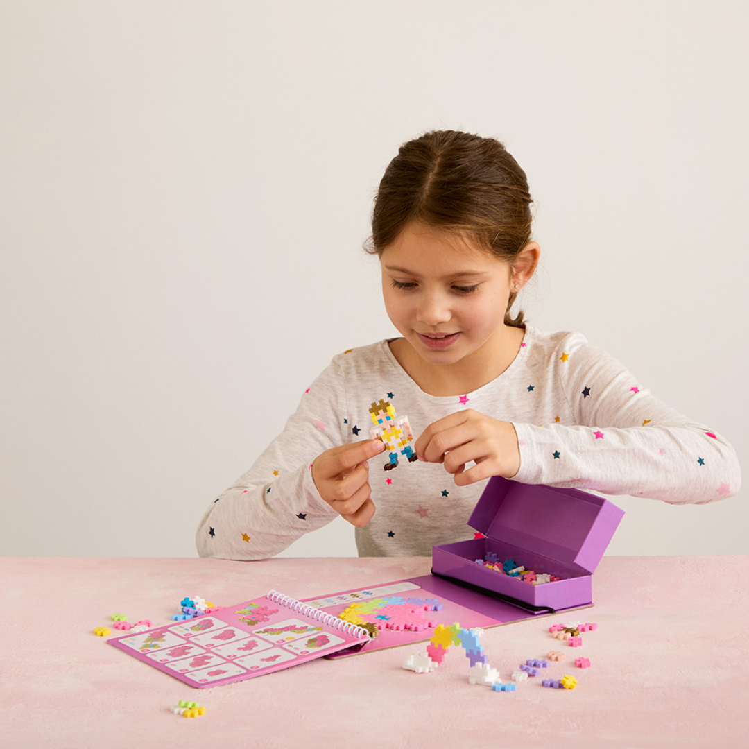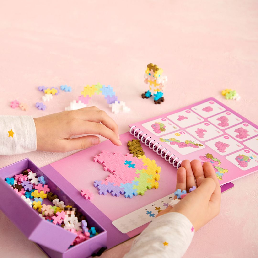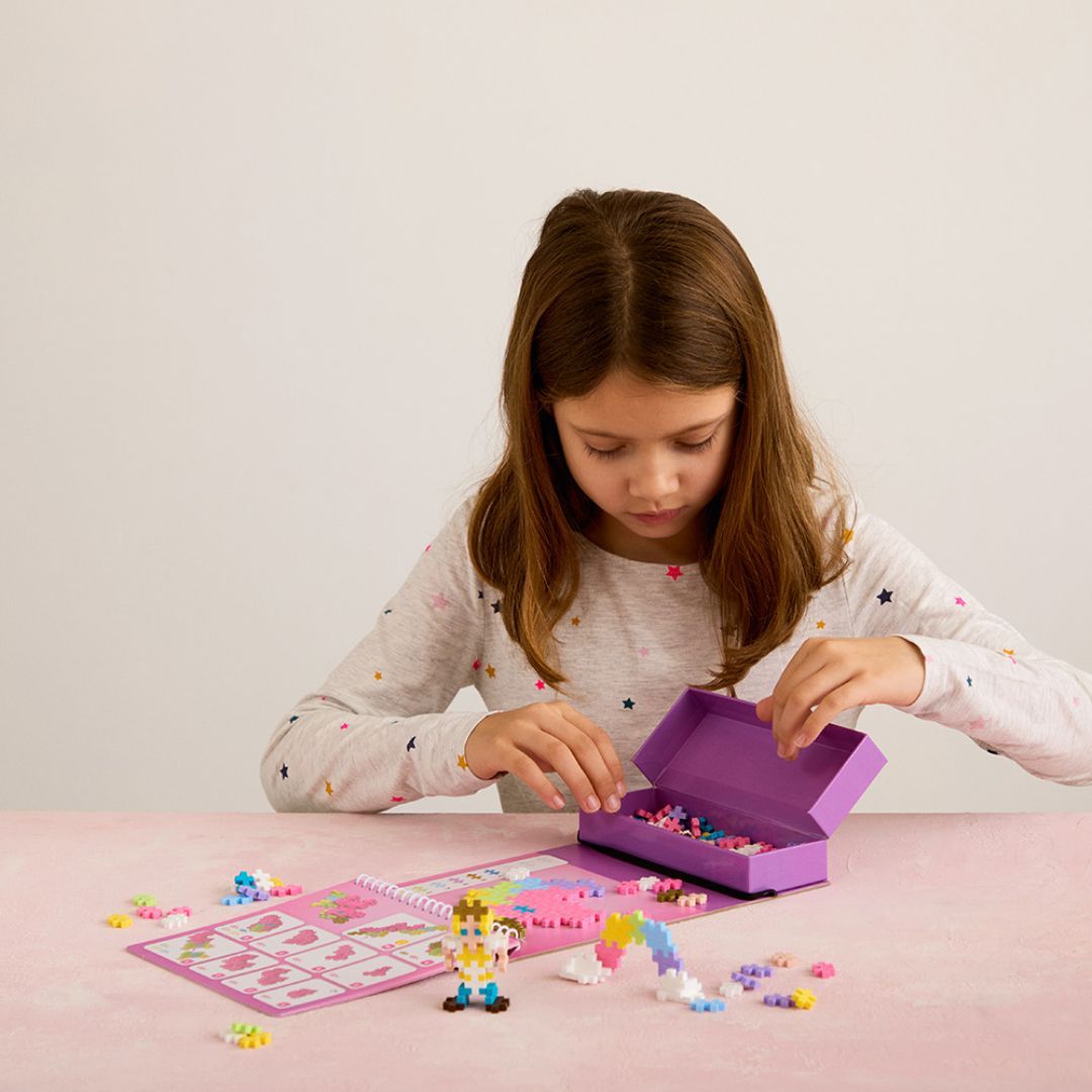 Plus-Plus Fairyland Activity Pad tar barna med inn i et eventyrlig univers fylt med enhjørninger, regnbuer og magiske figurer. Settet inkluderer 12 aktiviteter og 125 Plus-Plus-brikker, slik at barna kan lage både 2D-bilder og 3D-modeller. Perfekt til både hjemmelek og reise, og gir timevis med kreativ underholdning.