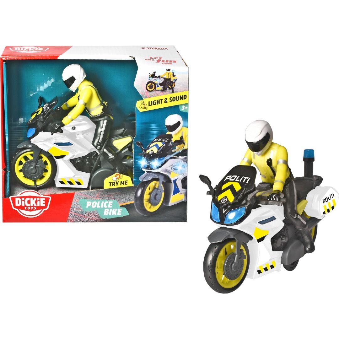 Norsk Yamaha politimotorsykkel fra Dickie Toys med friksjonsmotor, lys, lyd og l?s figur. 17 cm. Fra 3 ?r.