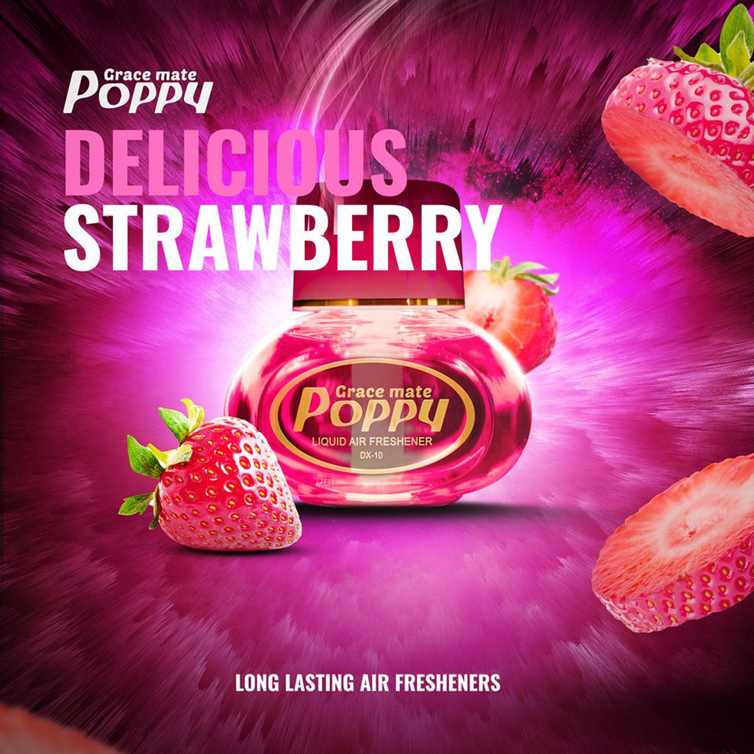 Grace Mate Poppy luftfrisker med søt duft av jordbær. Gir frisk fruktduft i bilen, båten eller hjemmet. Varer opptil 6 måneder.