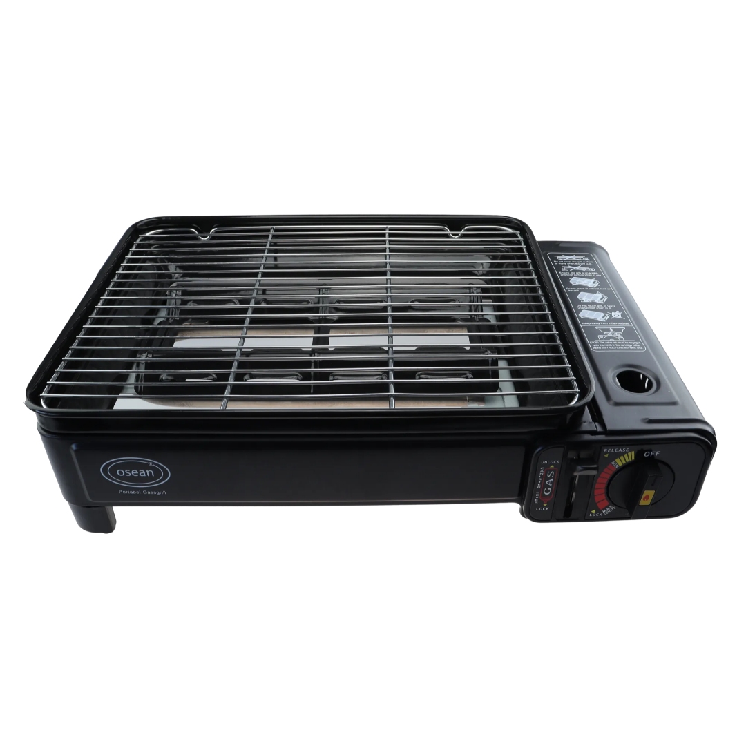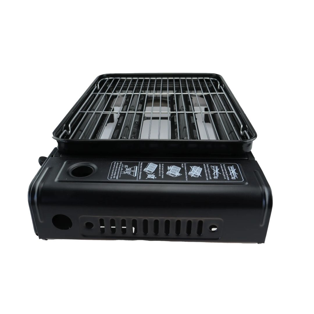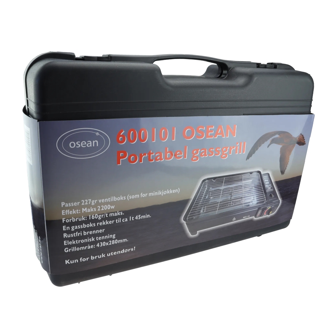 Portabel gassgrill i minikjøkken-format. Bruker gassbeholder med bajonett kobling (varenr. 600100), som også passer til gassovn, blåselampe, minikjøkken etc. (gassboks medfølger ikke) Grillen har rustfri brenner, piezo tenning og forkrommet grillrist. Grillområde 340x260mm. Forbruk: 138gr/time, 1 boks varer ca 1t 45min. Effekt: 1800w. 4 stk grillspyd samt rist til kasserolle medfølger også!