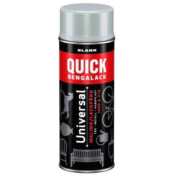 Med Quick Bengalack Spray har du påføringsverktøy og maling i ett – rist og spray! Den er utviklet til å gi en sterk og slitesterk overflate til underlag av metall, tre og hardplast – inne som ute. Sprayen kommer i mange flott farger og er ideell når «vanskelige» gjenstander med mange krinker og kroker skal fornyes. Sprayen gir en flott, hard og blank overflate som tørker på 1 time! Raskt og enkelt!