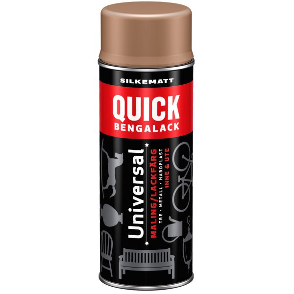 Med Quick Bengalack Spray har du påføringsverktøy og maling i ett – rist og spray! Den er utviklet til å gi en sterk og slitesterk overflate til underlag av metall, tre og hardplast – inne som ute. Sprayen kommer i mange flott farger og er ideell når «vanskelige» gjenstander med mange krinker og kroker skal fornyes. Sprayen gir en flott, hard og silkematt overflate som tørker på 1 time! Raskt og enkelt!