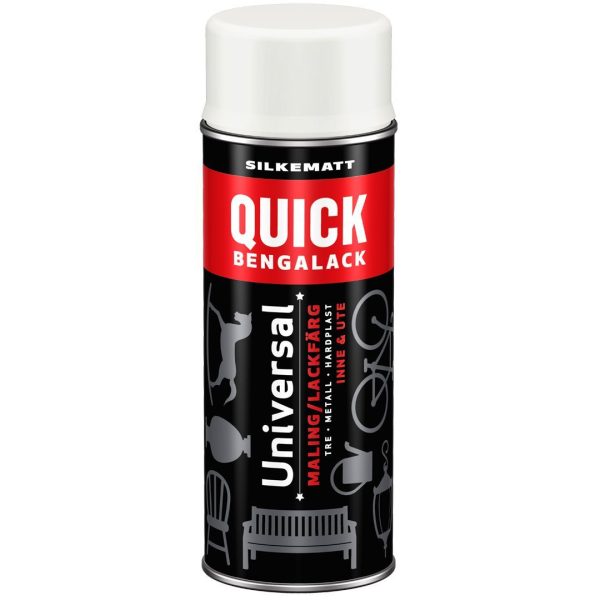 Med Quick Bengalack Spray har du påføringsverktøy og maling i ett – rist og spray! Den er utviklet til å gi en sterk og slitesterk overflate til underlag av metall, tre og hardplast – inne som ute. Sprayen kommer i mange flott farger og er ideell når «vanskelige» gjenstander med mange krinker og kroker skal fornyes. Sprayen gir en flott, hard og silkematt overflate som tørker på 1 time! Raskt og enkelt!