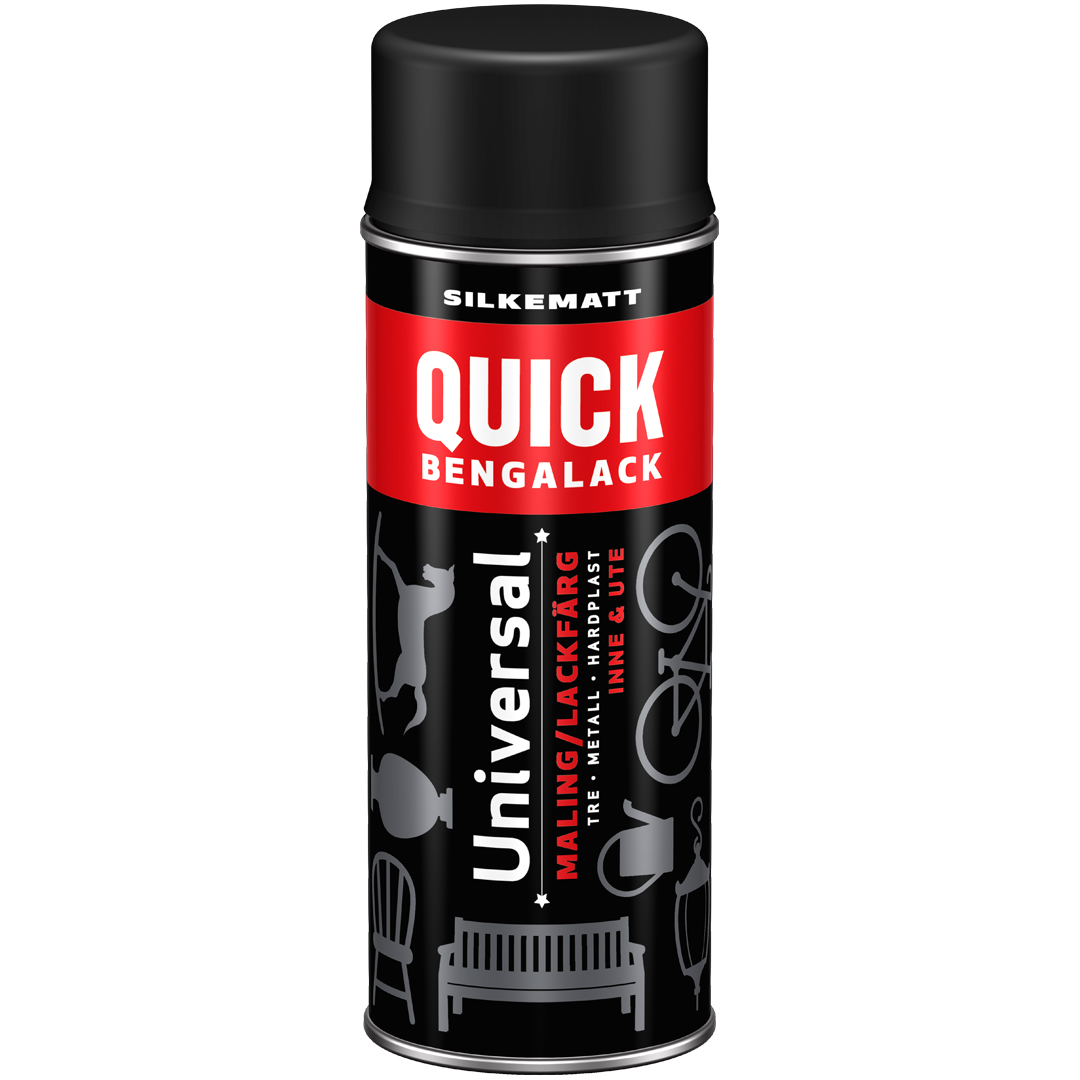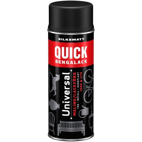 Med Quick Bengalack Spray har du påføringsverktøy og maling i ett – rist og spray! Den er utviklet til å gi en sterk og slitesterk overflate til underlag av metall, tre og hardplast – inne som ute. Sprayen kommer i mange flott farger og er ideell når «vanskelige» gjenstander med mange krinker og kroker skal fornyes. Sprayen gir en flott, hard og silkematt overflate som tørker på 1 time! Raskt og enkelt!