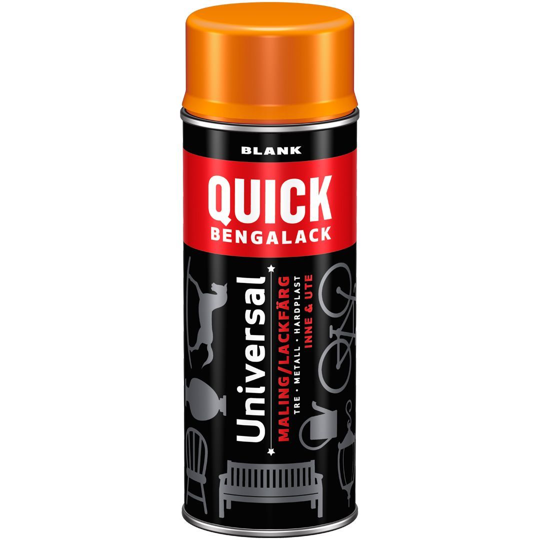 Med Quick Bengalack Spray har du påføringsverktøy og maling i ett – rist og spray! Den er utviklet til å gi en sterk og slitesterk overflate til underlag av metall, tre og hardplast – inne som ute. Sprayen kommer i mange flott farger og er ideell når «vanskelige» gjenstander med mange krinker og kroker skal fornyes. Sprayen gir en flott, hard og silkematt overflate som tørker på 1 time! Raskt og enkelt!