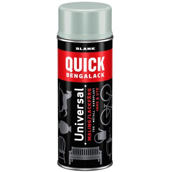 Med Quick Bengalack Spray har du påføringsverktøy og maling i ett – rist og spray! Den er utviklet til å gi en sterk og slitesterk overflate til underlag av metall, tre og hardplast – inne som ute. Sprayen kommer i mange flott farger og er ideell når «vanskelige» gjenstander med mange krinker og kroker skal fornyes. Sprayen gir en flott, hard og silkematt overflate som tørker på 1 time! Raskt og enkelt!
