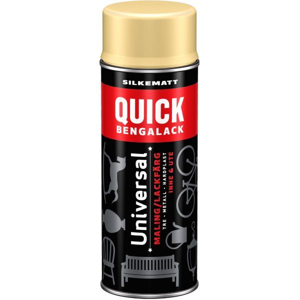 Med Quick Bengalack Spray har du påføringsverktøy og maling i ett – rist og spray! Den er utviklet til å gi en sterk og slitesterk overflate til underlag av metall, tre og hardplast – inne som ute. Sprayen kommer i mange flott farger og er ideell når «vanskelige» gjenstander med mange krinker og kroker skal fornyes. Sprayen gir en flott, hard og silkematt overflate som tørker på 1 time! Raskt og enkelt!