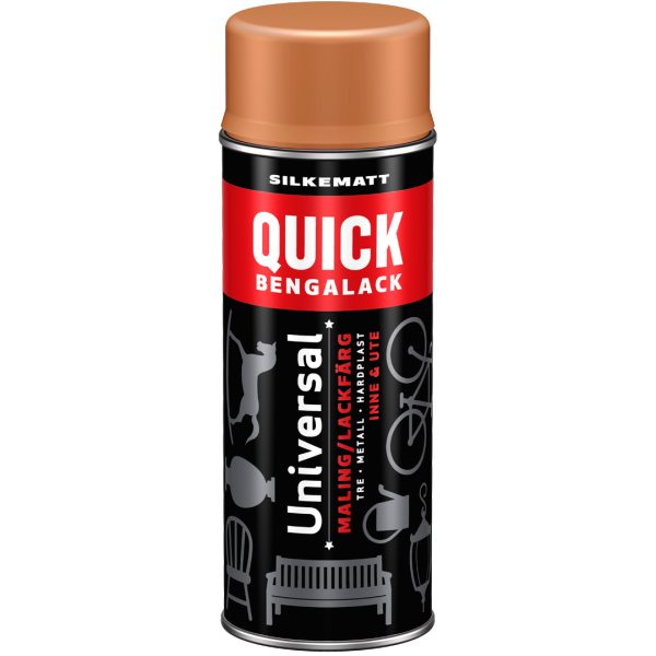 Med Quick Bengalack Spray har du påføringsverktøy og maling i ett – rist og spray! Den er utviklet til å gi en sterk og slitesterk overflate til underlag av metall, tre og hardplast – inne som ute. Sprayen kommer i mange flott farger og er ideell når «vanskelige» gjenstander med mange krinker og kroker skal fornyes. Sprayen gir en flott, hard og silkematt overflate som tørker på 1 time! Raskt og enkelt!