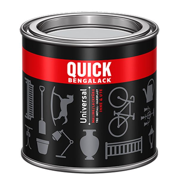 Quick Bengalack Universal gir en flott, silkematt overflate og kan brukes på så og si alt. Den er utviklet til å gi en sterk og slitesterk overflate til underlag av metall, tre og hardplast – inne som ute. Brukt i kombinasjon med Quick Bengalack Grunning vil du få en overfalte som varer i år etter år. Brukes gjerne på møbler, hagemøbler, sykler, lamper, potter, lysestaker, flaggstenger, smijernsporter ol. Kan blandes i nærmest all verdens farger!