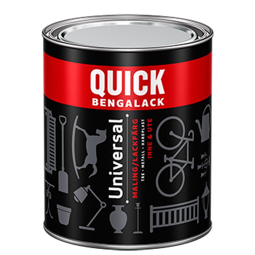 Quick Bengalack Universal gir en flott, silkematt overflate og kan brukes på så og si alt. Den er utviklet til å gi en sterk og slitesterk overflate til underlag av metall, tre og hardplast – inne som ute. Brukt i kombinasjon med Quick Bengalack Grunning vil du få en overfalte som varer i år etter år. Brukes gjerne på møbler, hagemøbler, sykler, lamper, potter, lysestaker, flaggstenger, smijernsporter ol. Kan blandes i nærmest all verdens farger!
