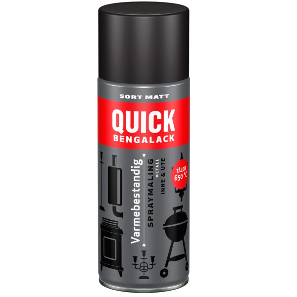 Quick Bengalack Varmebestandig spray er en sort matt spraymaling som tåler hele 650 C. Utmerket til griller, eksosanlegg, gressklippere, ovner, peiser mm. Den er svært fargebestandig og holder seg godt over lang tid.