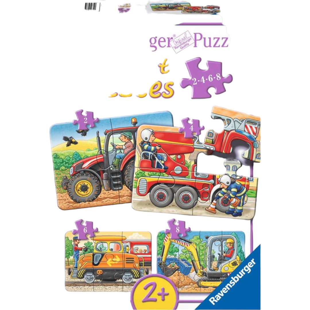 La barna utforske traktorer og maskiner med dette morsomme puslespillsettet. Med fire puslespill i ulike vanskelighetsgrader, fra 2 til 8 brikker, vil de små lære og ha det gøy samtidig.
