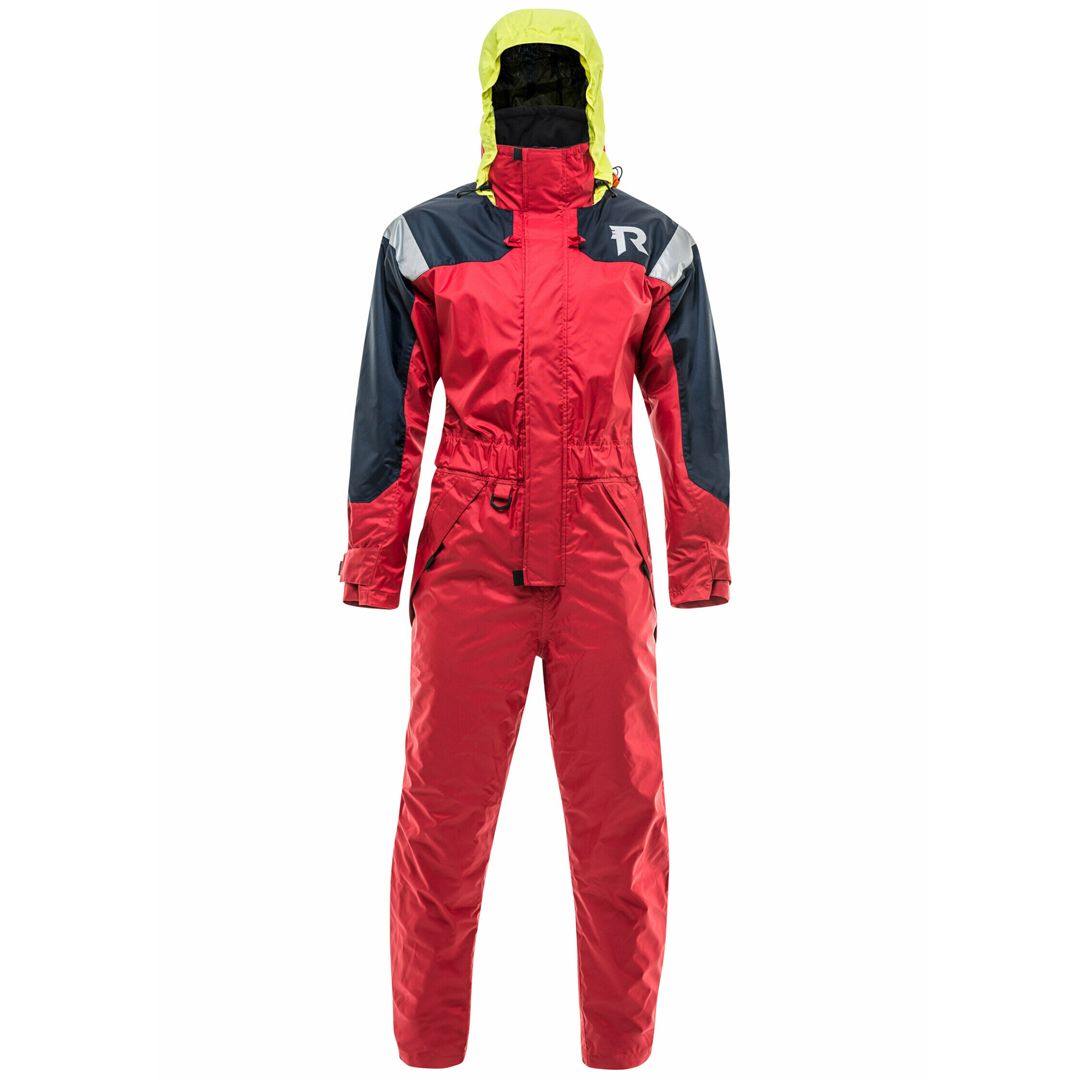 Justerbare mansjetter i ermene, stopper vanninntrengning. Ekstra lang glidelås-åpning på ben (45 cm), med kile og skråstilte borrelåser. Ventilasjons-åpninger under armene med vannavvisende glidelås. Fleece i kragen for økt komfort. Innstramming i livet. Justerbar fluoriserende gul hette som kan foldes inn i kragen. Festehemper for oppblåsbar redningsvest. Fløyte, samt D-ring for nødstopp o. L.