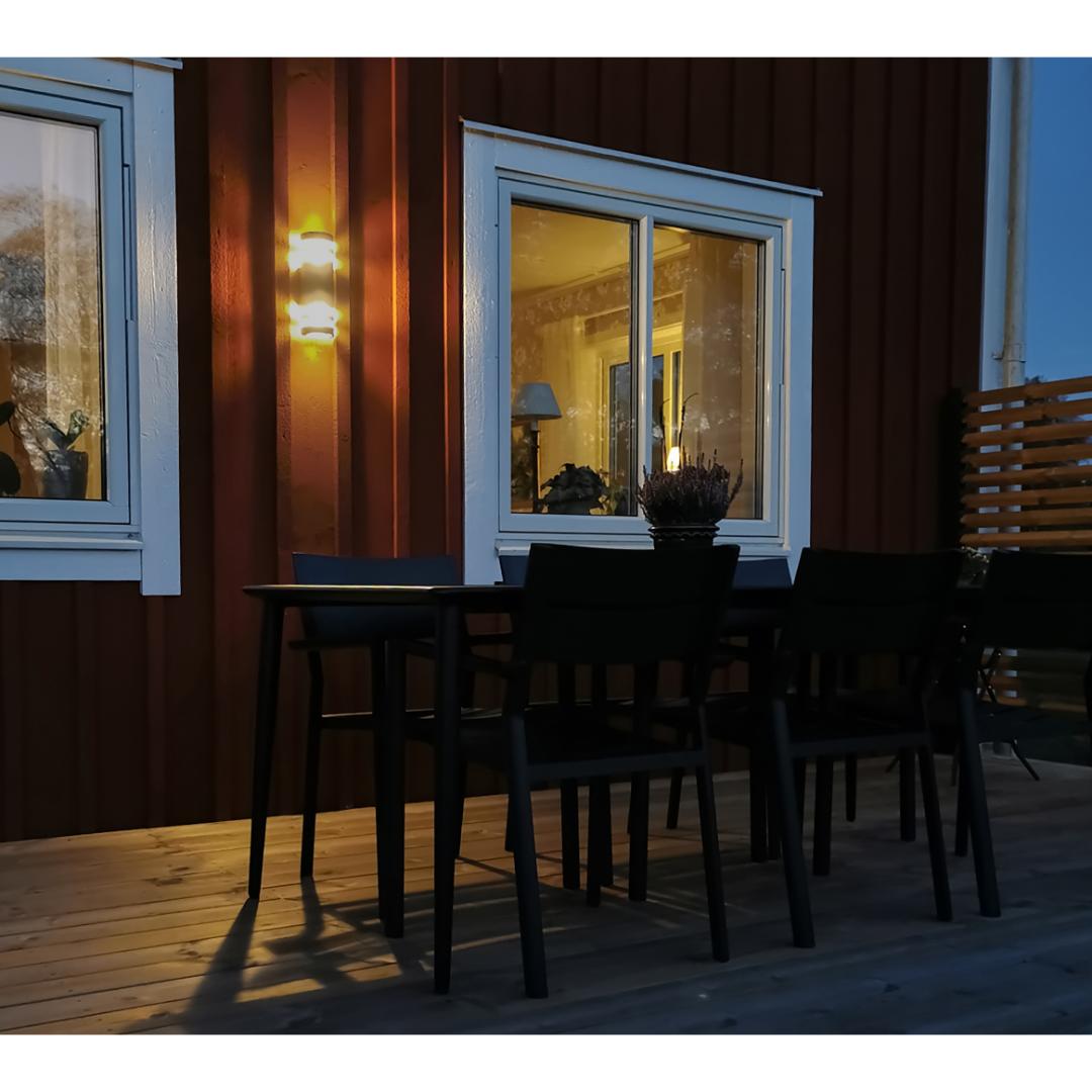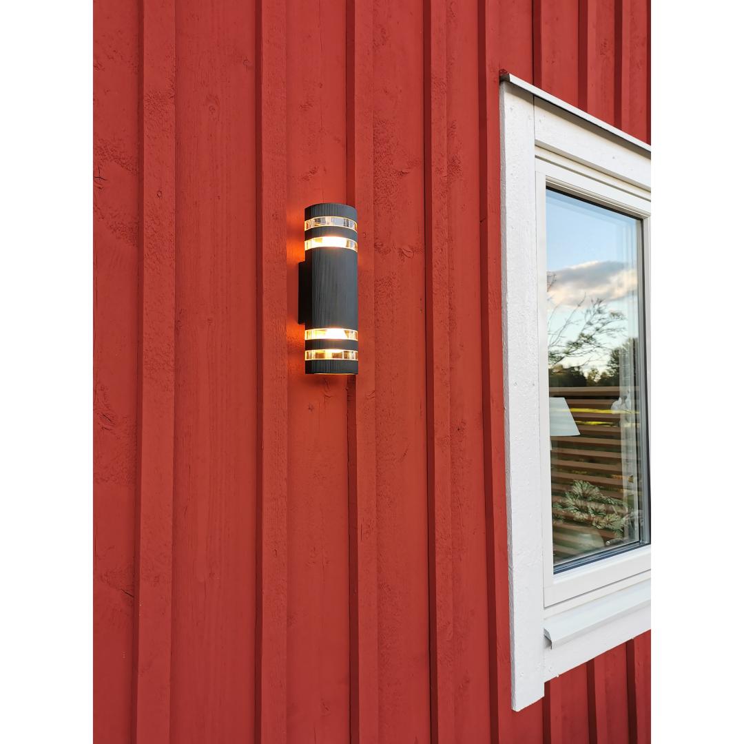 Ribb vegglampe i svart aluminium gir et moderne og dekorativt lys både oppover og nedover langs fasaden. Lampen passer perfekt som fasadebelysning og skaper et elegant uttrykk ved inngangsparti, terrasse eller garasje. Den er laget for utendørs bruk og kombinerer funksjon med stilrent design.
