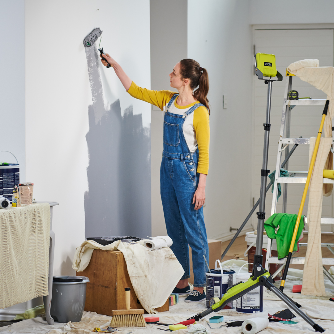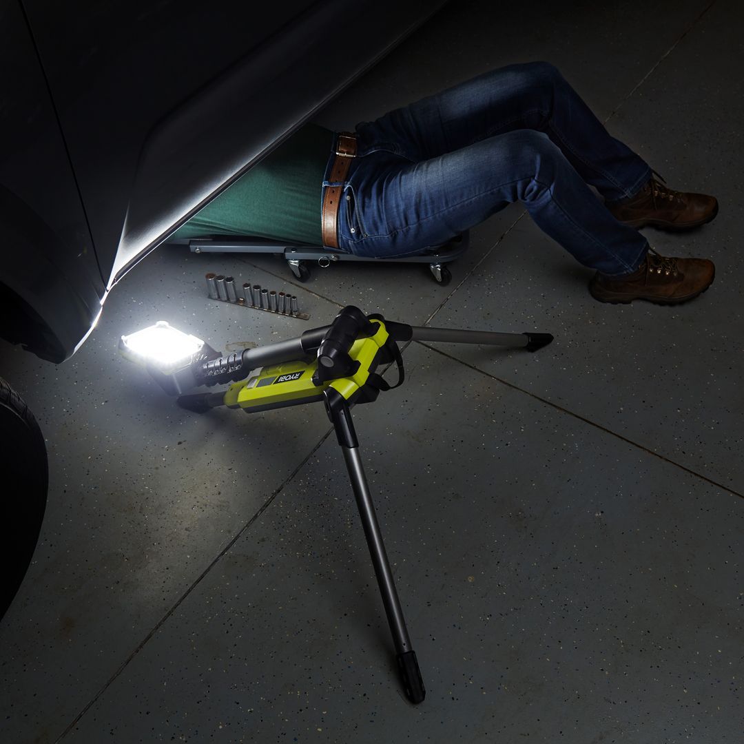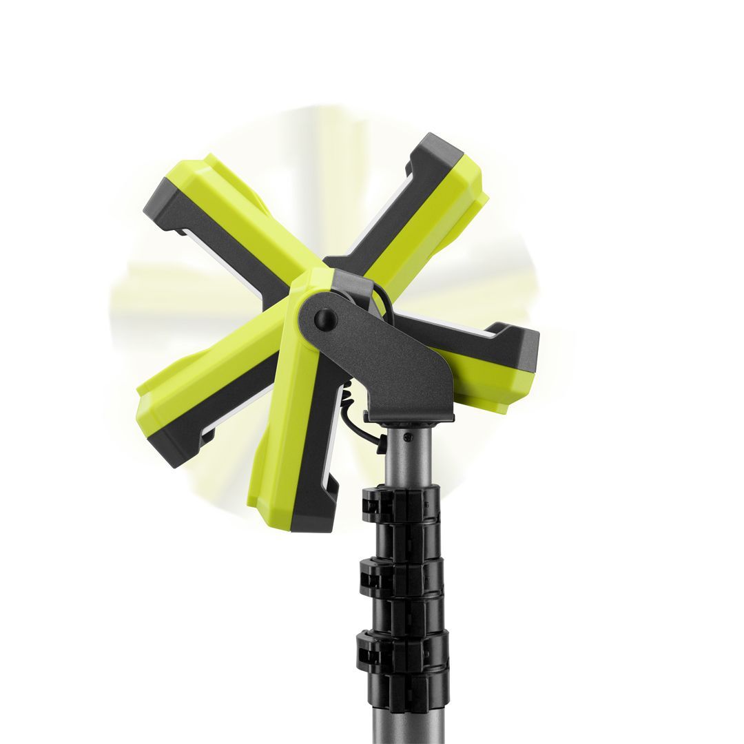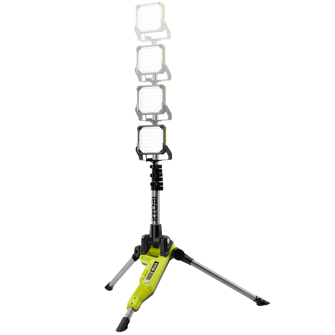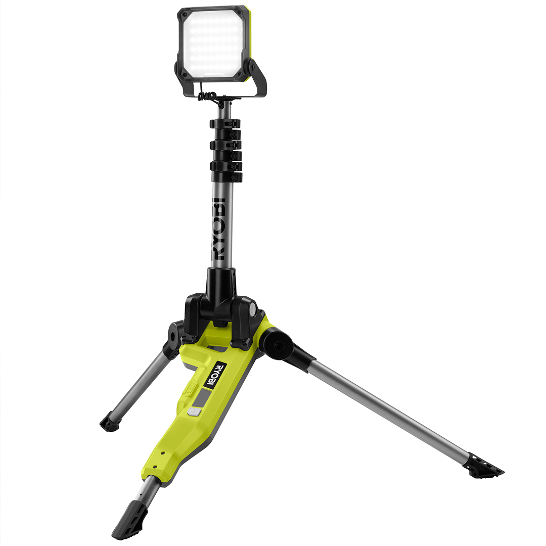 Ryobi arbeidslys på stativ R18TL-0. Høyeffektiv LED-lampe med 360 med 3 lysstyrker: 2700- / 1000- / 500 lumen. Det forlengbare stativet når opptil 1,7 m for å belyse større områder. Sammenleggbar for transport og kompakt oppbevaring. Leveres uten batteri og lader.