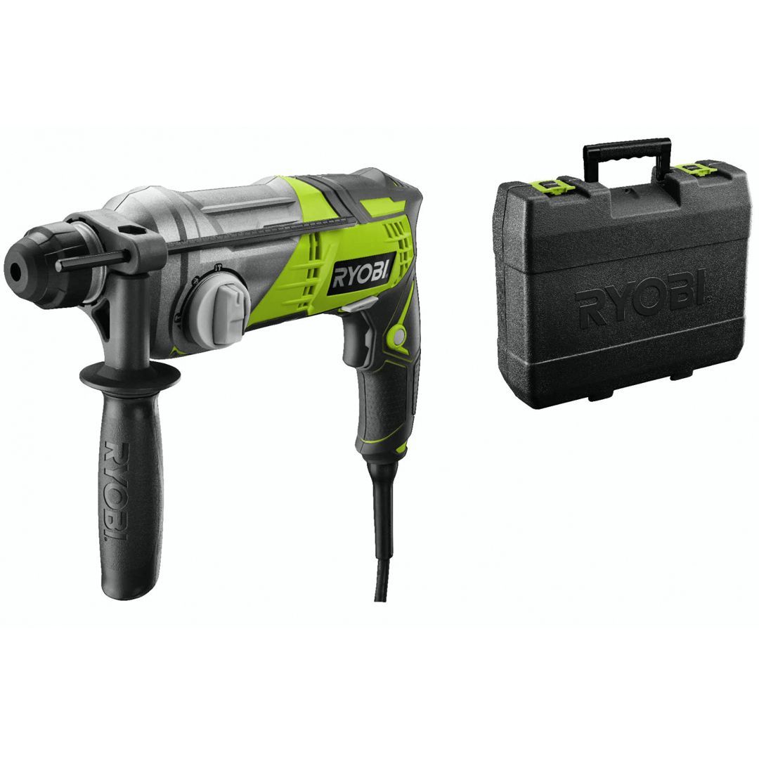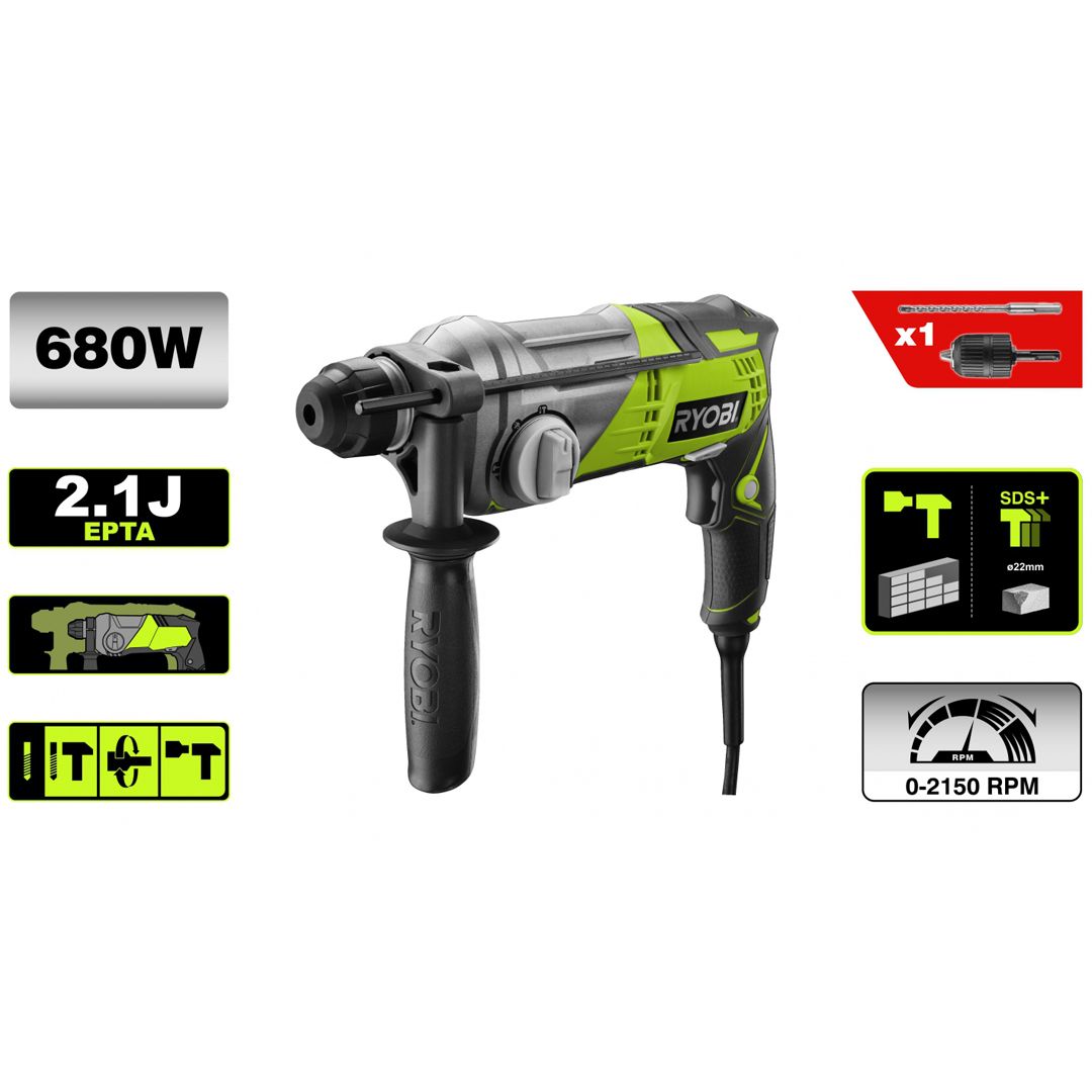 Ryobi RSDS680-K er en 680W SDS-Plus kombinasjonsborhammer som forenkler tung boring og meisling i betong og mur. Den har fire funksjonsmoduser: slagboring (hammer + rotasjon) for betong, vanlig boring (uten slag) for tre og metall, meisling (kun hammer) for pigging av fliser/betong, og meiseljustering for å rotere meisel til ønsket vinkel. Den pneumatiske hammermekanismen leverer 2,1 Joule slagenergi (EPTA) og opptil 5000 slag/min, noe som gir imponerende borekapasitet i betong (opptil Ø 22 mm). Motoren har variabel hastighet 02150 o/min som sammen med slagkraften gir rask fremdrift i harde materialer. SDS-Plus chucken gjør det enkelt og raskt å bytte bor og meisler uten verktøy, og maskinen er designet for komfort med relativt lav vekt (2,7 kg) og et hjelpehåndtak som kan roteres 360° for optimal kontroll. RSDS680-K leveres i koffert med 6 mm og 8 mm SDS+ bor samt en avtagbar 13 mm chuckadapter for bruk av vanlige bor.