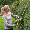 Ryobi ONE+ 18V Hekksaks. Denne hekksaksen er utstyrt med en kraftig motor som leverer høyt moment for effektiv klipping under alle forhold. Med en sverdlengde på 50 cm, som er både laserskåret og diamantslipt, gir den en eksepsjonell klippekvalitet, ideell for trimming av hekker i forskjellige størrelser. Hekksaksen har en grenkapasitet på 22 mm og en sagfunksjon som gjør det enkelt å håndtere større grener.
