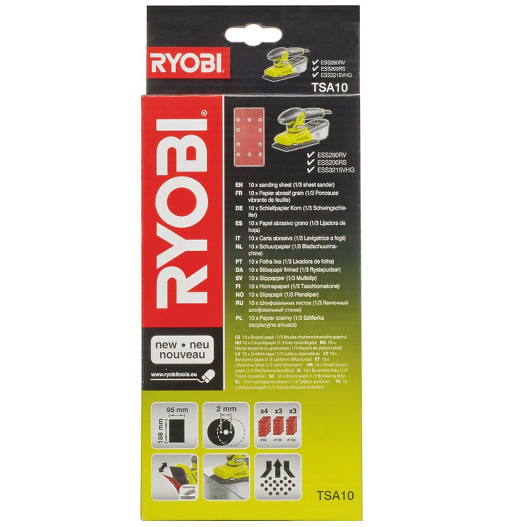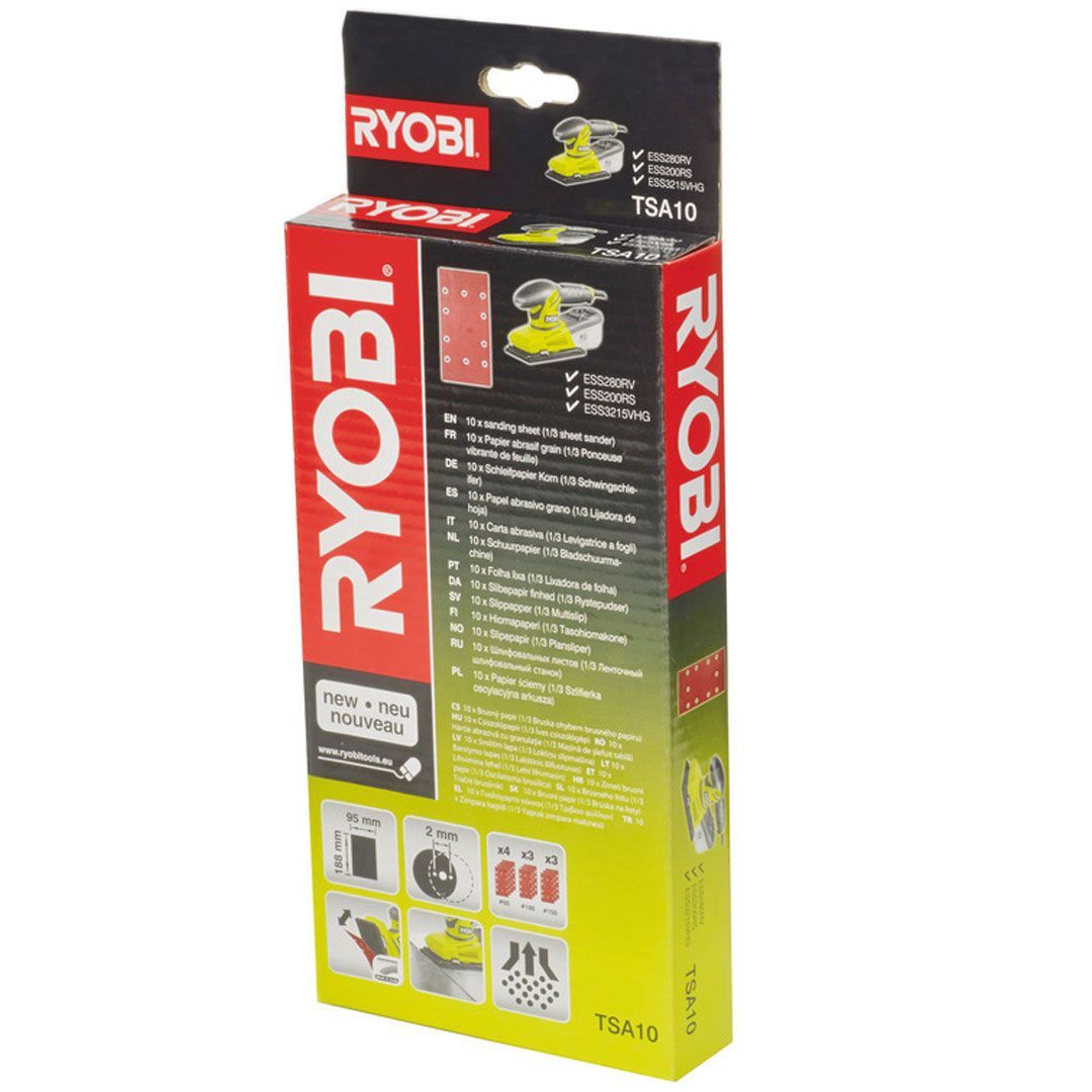 Ryobi sandpapirsett TSA10 – 10 deler. Dette settet med 1/3-ark sandpapir er ideelt for lette til medium oppgaver som finpussing og malingsfjerning. Settet inkluderer sandpapir med tre forskjellige kornstørrelser for å dekke et bredt spekter av slipebehov: