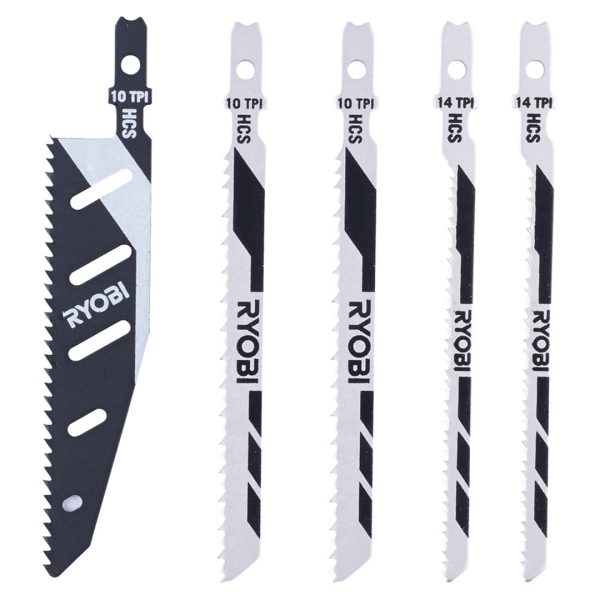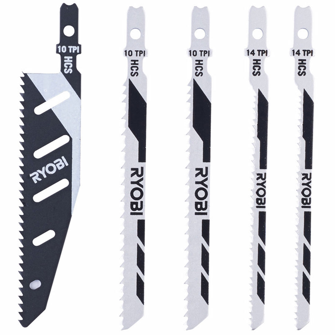 Ryobi stikksagblad RAK05JS. Inneholder: 1 x 102 mm Flush Cut (10 TPI), 2 x 102 mm Reverse cut (10TPI). , 2 x 102 mm Scroll cut (14 TPI).