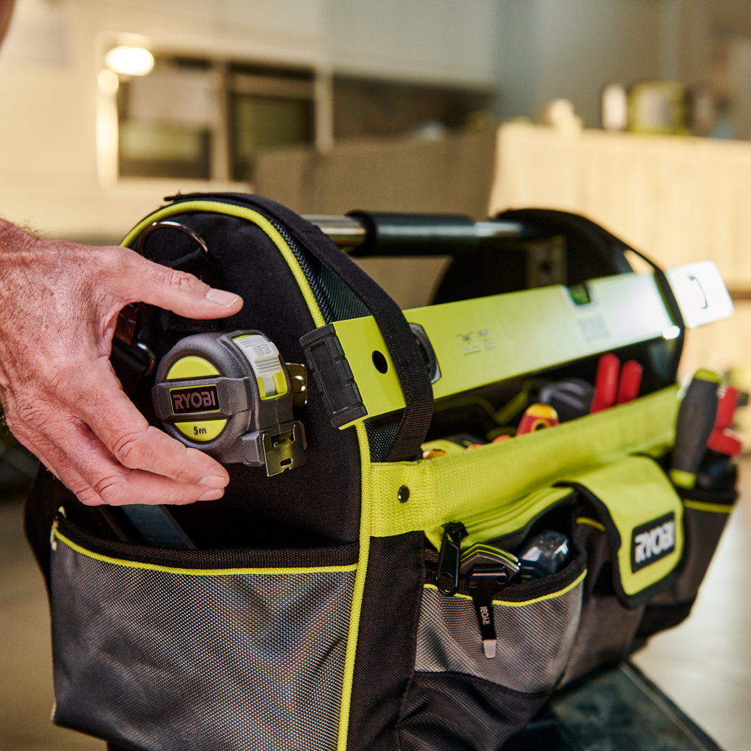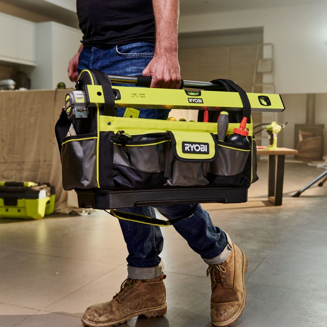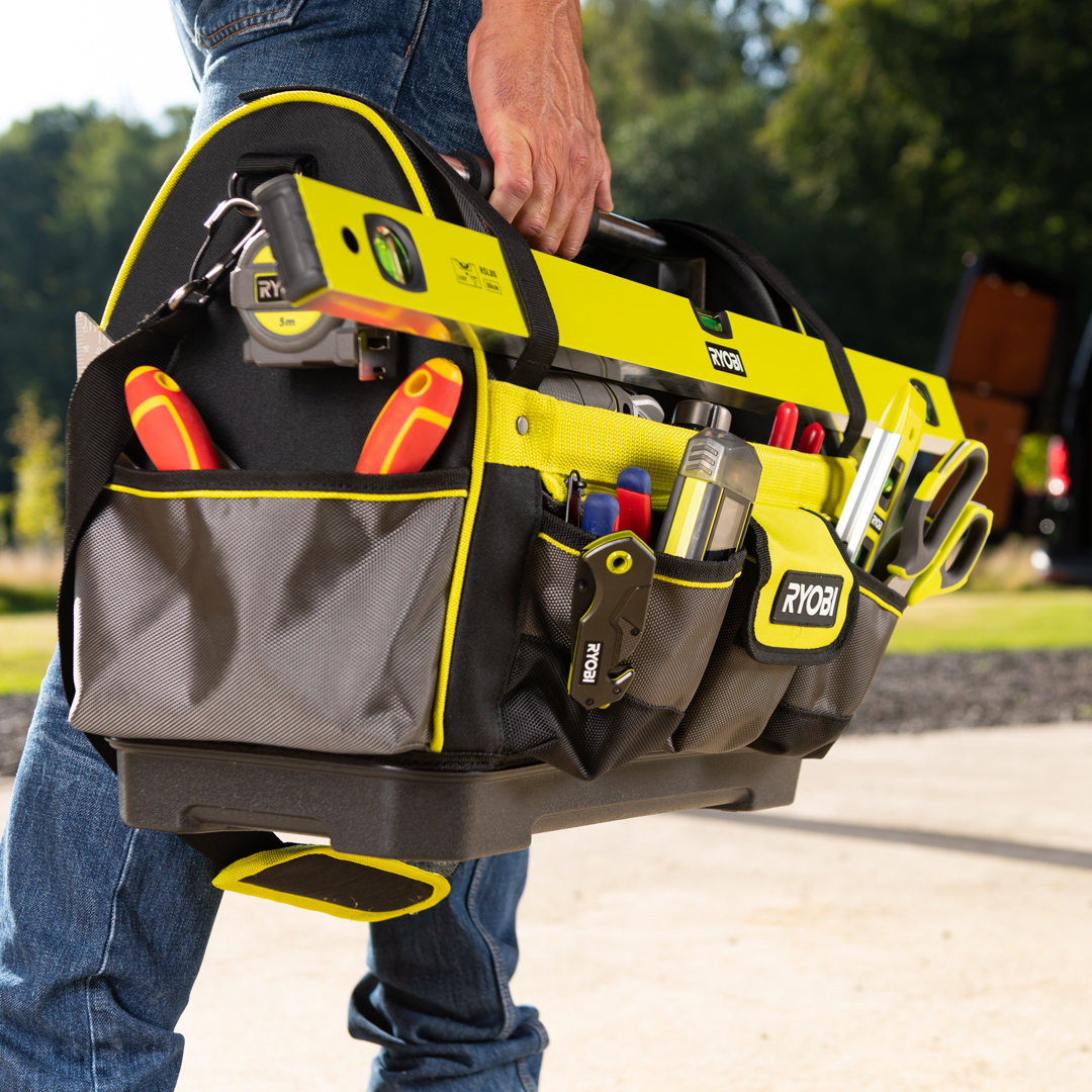 Ryobi RSSLOT1 er en stor, åpen verktøyveske designet for enkel tilgang og oppbevaring. Laget med slitesterkt 600 denier yttermateriale og 1680 denier i lommene, tilbyr denne vesken langvarig holdbarhet. Hardbunnen i polypropylen gir ekstra stabilitet, mens det gummibelagte håndtaket i aluminium og den ergonomisk polstrede skulderstroppen gir god komfort.