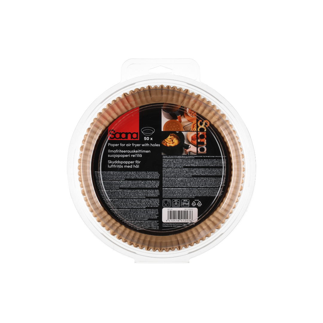 Engangspapir med perforering som slipper luft gjennom og gjør rengjøringen enklere. Passer airfryere på ca. 3,5–6 L og kan også brukes i stekeovn, mikrobølgeovn og på stekepanne. Varmeresistent opp til 230 °C.