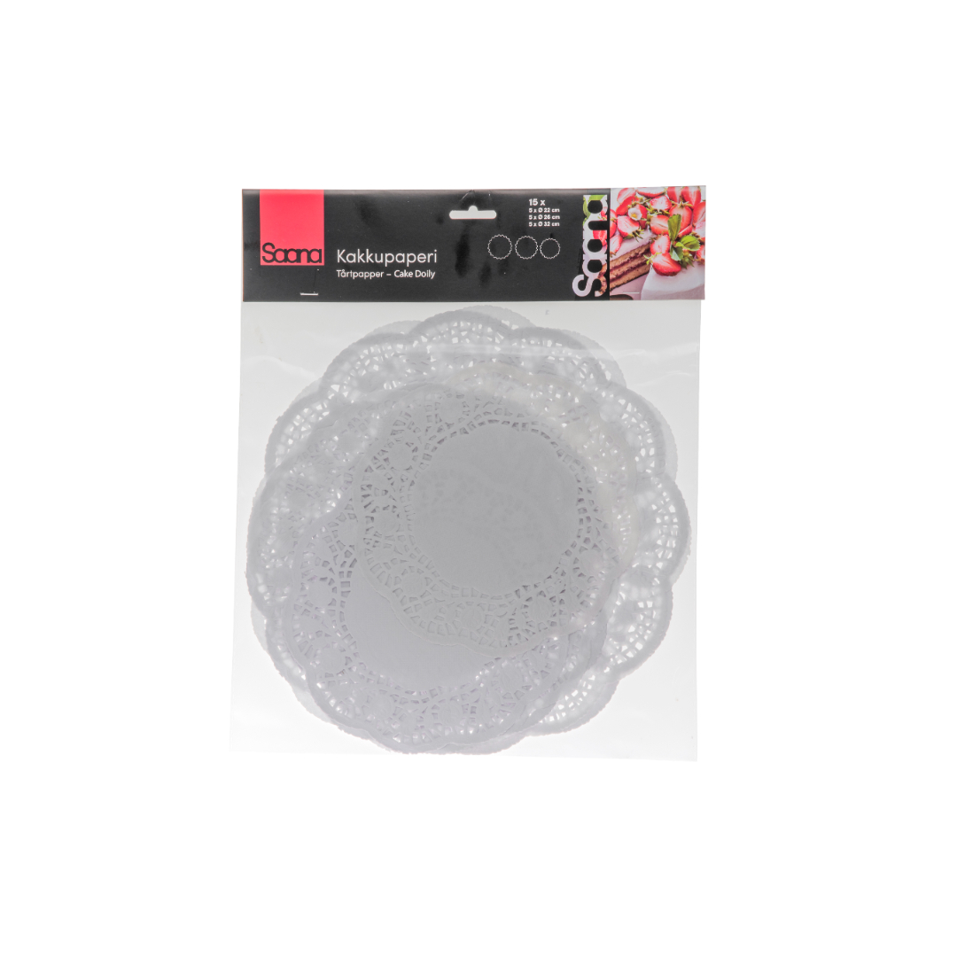Runde hvite kakepapir med blondekant. Pakke med 15 stk fordelt på tre vanlige diametre til servering og pynt.
