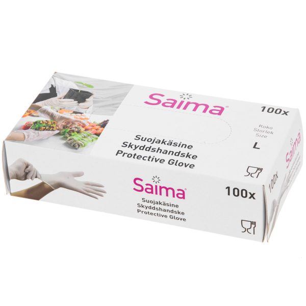 Vinylhansker størrelse L. Egnet for mathåndtering. Anbefales ikke å bruke sammen med fet mat. Pulverfri og ftalatfri. 100 stk pr pakke.