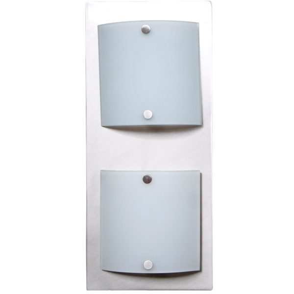 Salerno vegglampe dobbeli stål farge med hvite glass. Denne lampen er dimbar med dimmerbryter plassert på siden av lampen. Dette er en lampe somkan brukes ved siden av sengen, i stuen eller i en trapp eller plasser hvor man ikke ønsker at lampen tar for stor plass.