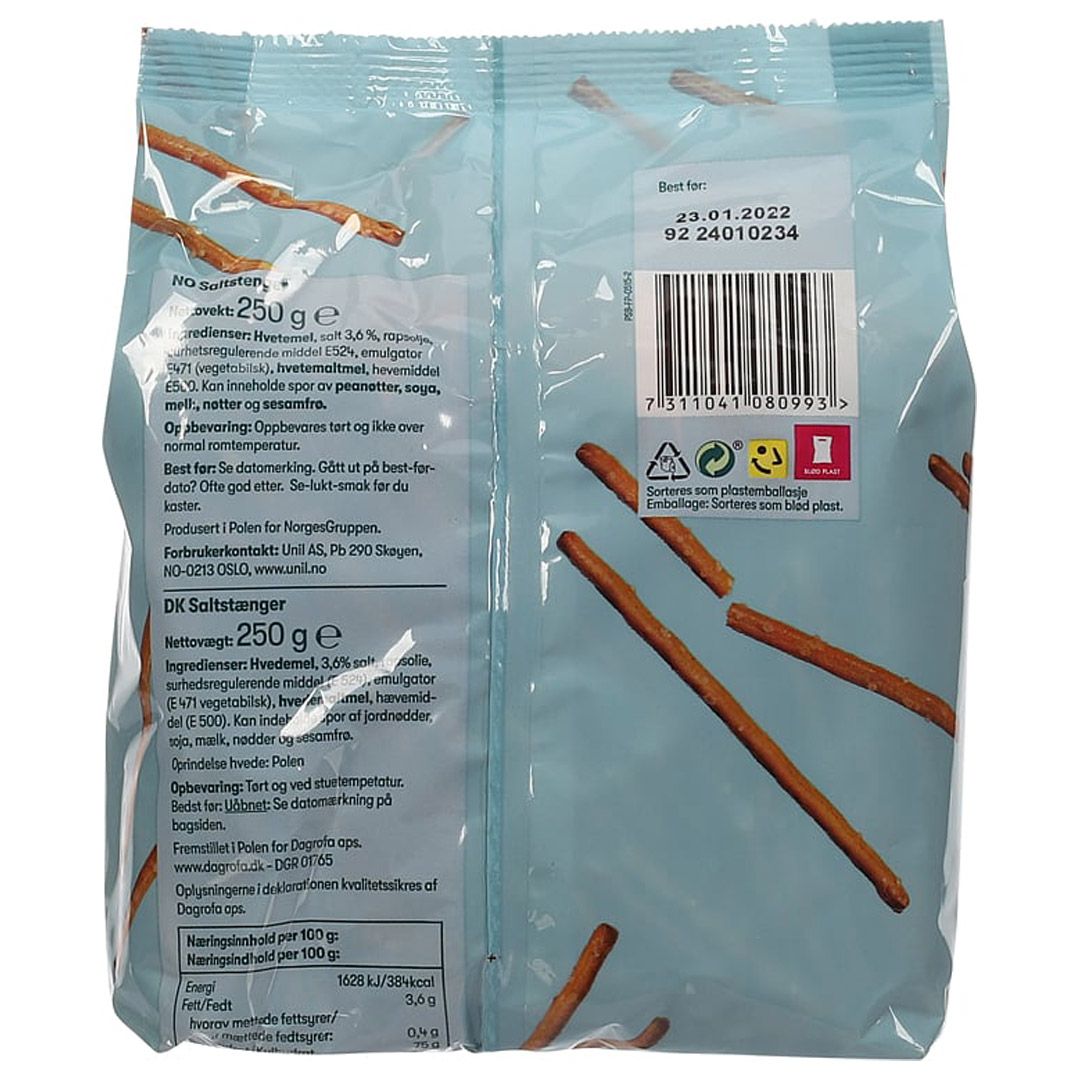 Saltstenger, en snacks som passer til alle festlige anledninger! Ingredienser: Hvetemel, salt 3,6 %, rapsolje, surhetsregulerende middel E524, emulgator E471 (vegetabilsk), hvetemaltmel, hevemiddel E500. Informasjonen er levert av leverandør og produsent. Vi tar forbehold om avvik. Om du har behov for garanti må du sjekke forpakning eller kontakte produsent.