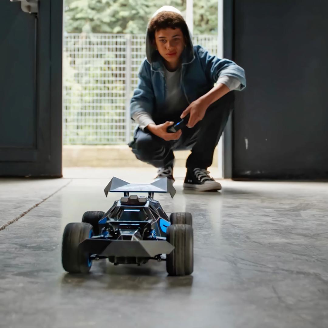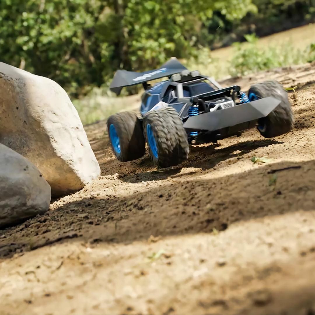 Bilen har en lengde på 33 cm og et tøft karosseri inspirert av sportsbiler. De store hjulene gir godt grep, mens firehjulsopphenget absorberer støt og gjør kjøringen jevn. 2,4 GHz-frekvensen sikrer stabil forbindelse uten forstyrrelser, slik at flere kan kjøre samtidig uten signalproblemer.