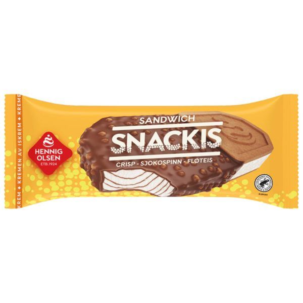 Snack-is er en velsmakende sandwich-is med crispkuler, sjokospinn og fløteis. Med RFA sertifisert kakao.