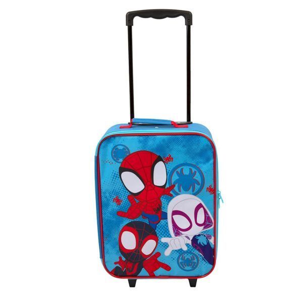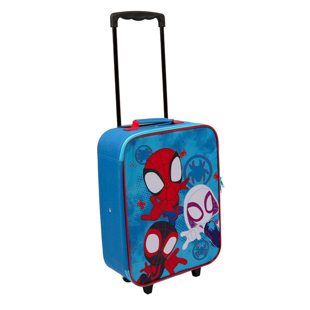 Praktisk barnekoffert med Spidey-motiv. Stort hovedrom, toveis glidelås og justerbart, låsbart teleskophåndtak. To hjul og støtteben for stabil rulling – ideell til reise og skole.