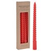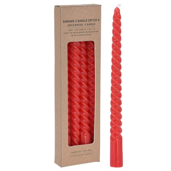 Stearinlys vridd 25 cm (4-pk) i rød tilfører en varm og tradisjonell atmosfære til høytiden. Disse lysene er ideelle for julebord, festlige middager eller som dekorasjon gjennom hele vinteren. Den vridde designen gir et elegant og klassisk uttrykk.