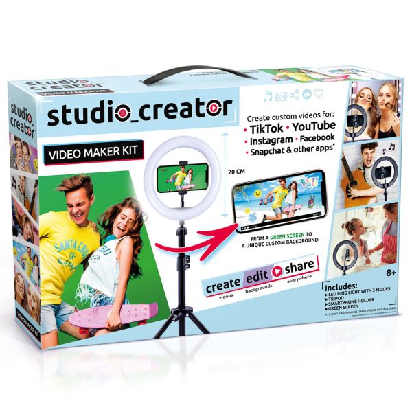 Lag profesjonelle videoer med Studio Creator Video Maker Kit. Settet inkluderer alt du trenger for å lage engasjerende innhold, inkludert en ringlys, stativ og grønn skjerm. Perfekt for unge innholdsskapere som ønsker å lage videoer for sosiale medier. Passer for barn fra 8 år og oppover.