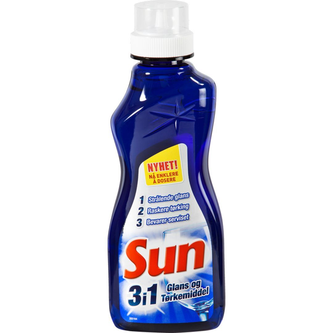 SUN 3 i 1 Glans og Tørkemiddel gir strålende glans, raskere tørking, og den beskytter serviset! SUN 3 i 1 Glans og Tørkemiddel gjør at vannet renner raskere av oppvasken, slik at vannmerker unngås og dermed får oppvasken mer glans. Jevnlig bruk av Glans og Tørkemiddel reduserer også slitasje på porselen og servise. Inneholder ikke fosfat.