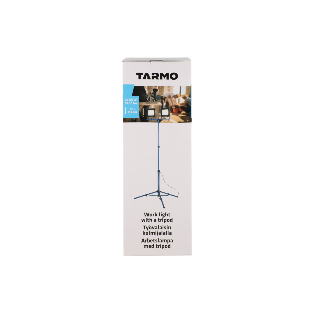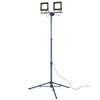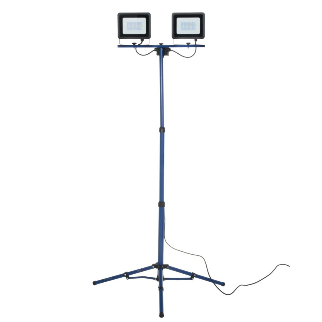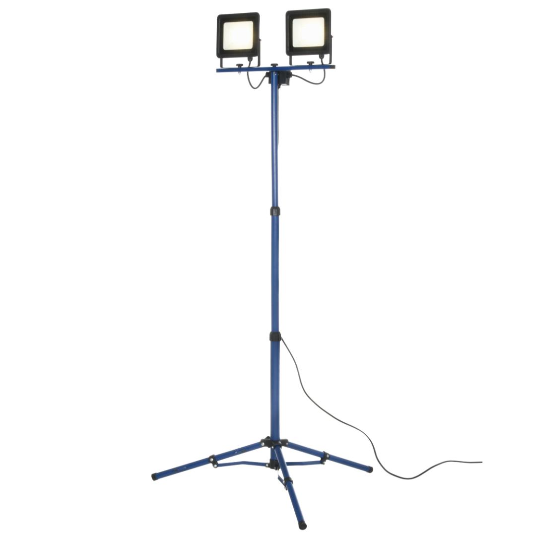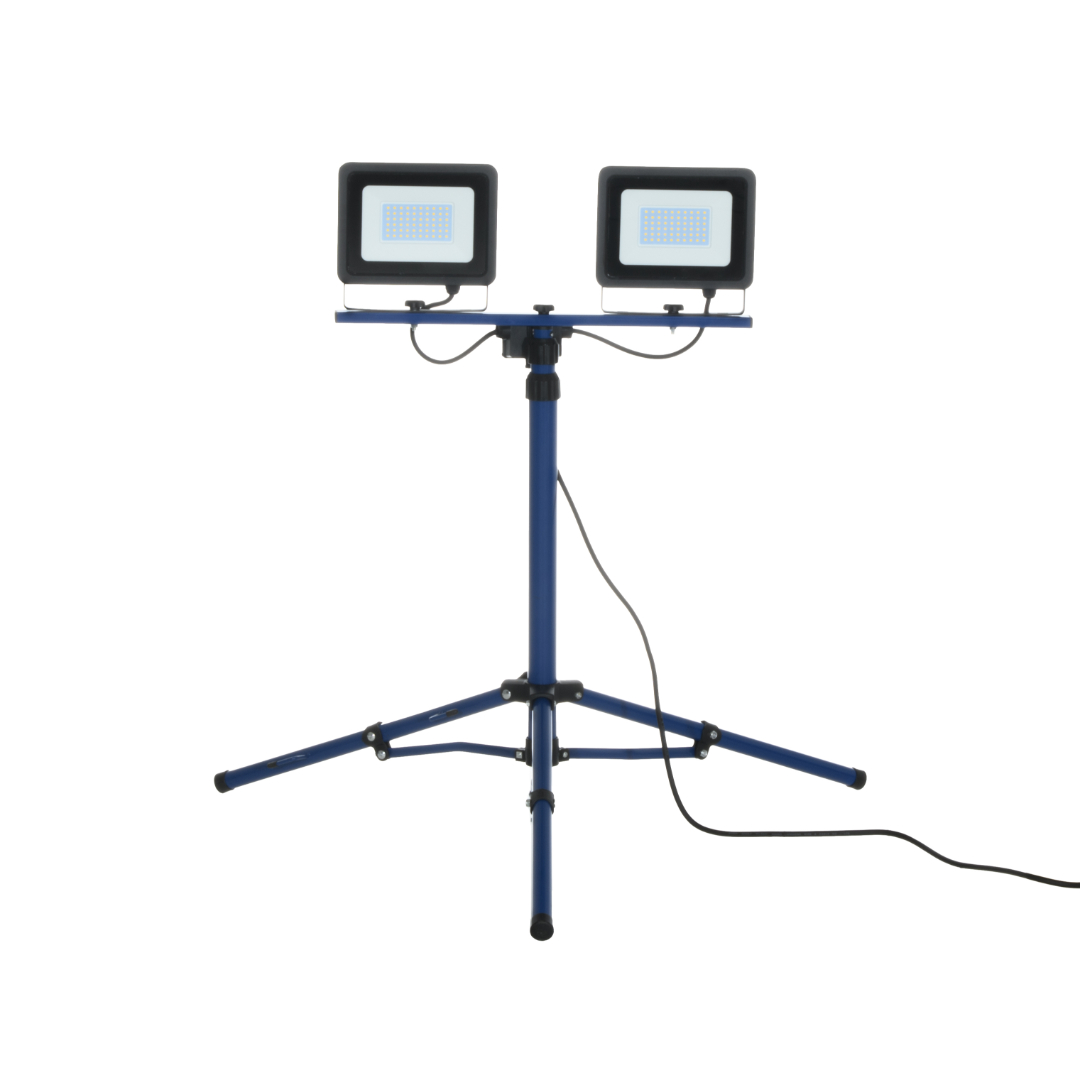 Kraftig arbeidslampe på stativ for maksimal belysning av arbeidsområdet. Teleskopstativet gir stabilitet og justerbar høyde, mens lampene kan vinkles etter behov.