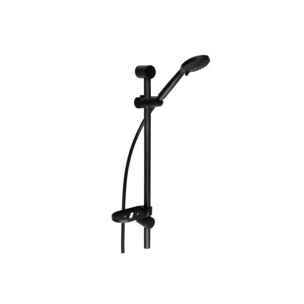 Komplett dusjsett i sort med glidestang, hånddusj, såpeholder og dusjslange. Hånddusjen har 3 strålefunksjoner, og glidestangen gir enkel høydejustering.