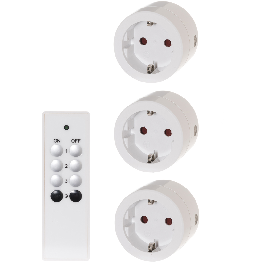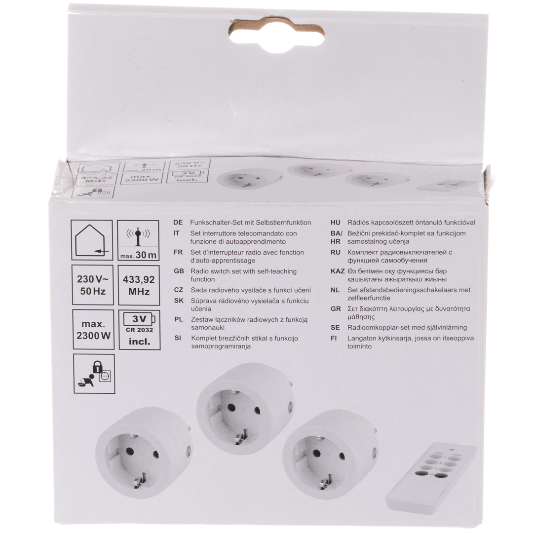 3 pakning med fjernstyrte kontakter for innendørs bruk. Maks belastning pr kontakt: 2300 Watt. Fjernkontroll: 433,92 MHz. Rekkevidde maks 30 meter. Fjernkontroll batteri: 1 x CR2032 er inkudert. Kapslingsgrad: IP20