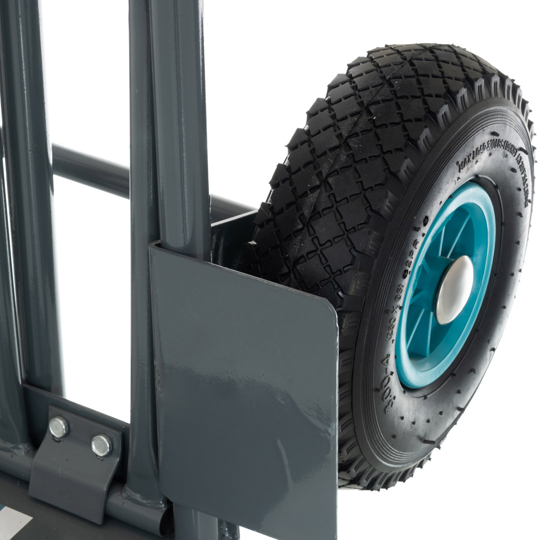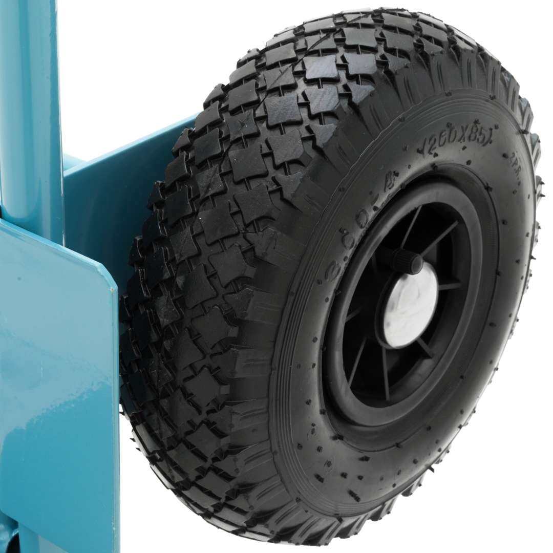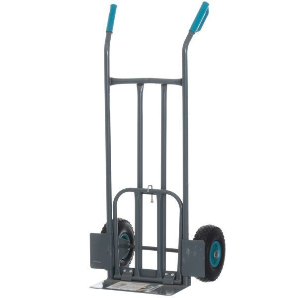 Sekketralle med slitesterk stålramme, PVC-belagte håndtak og store oppblåsbare dekk gjør det lett å flytte tunge last. Sammenleggbart lasteplan. Maks belastning 200 kg