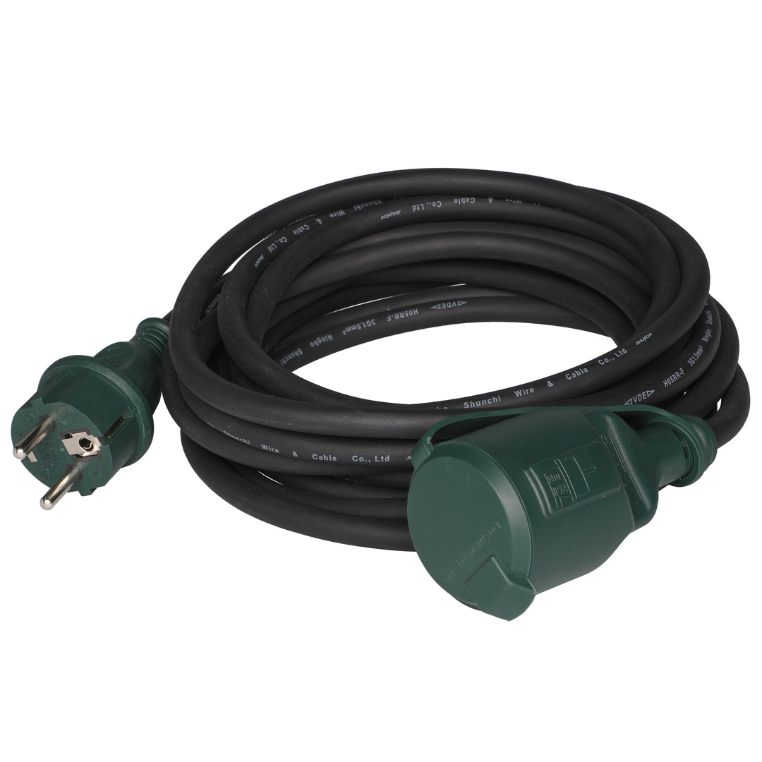 Gummi skjøteledning for utendørs bruk. Lengde 10 m. Kabeltype 3G1,5mm2 H05RR-F. Sprutsikker IP44. 16 A/250 V.
