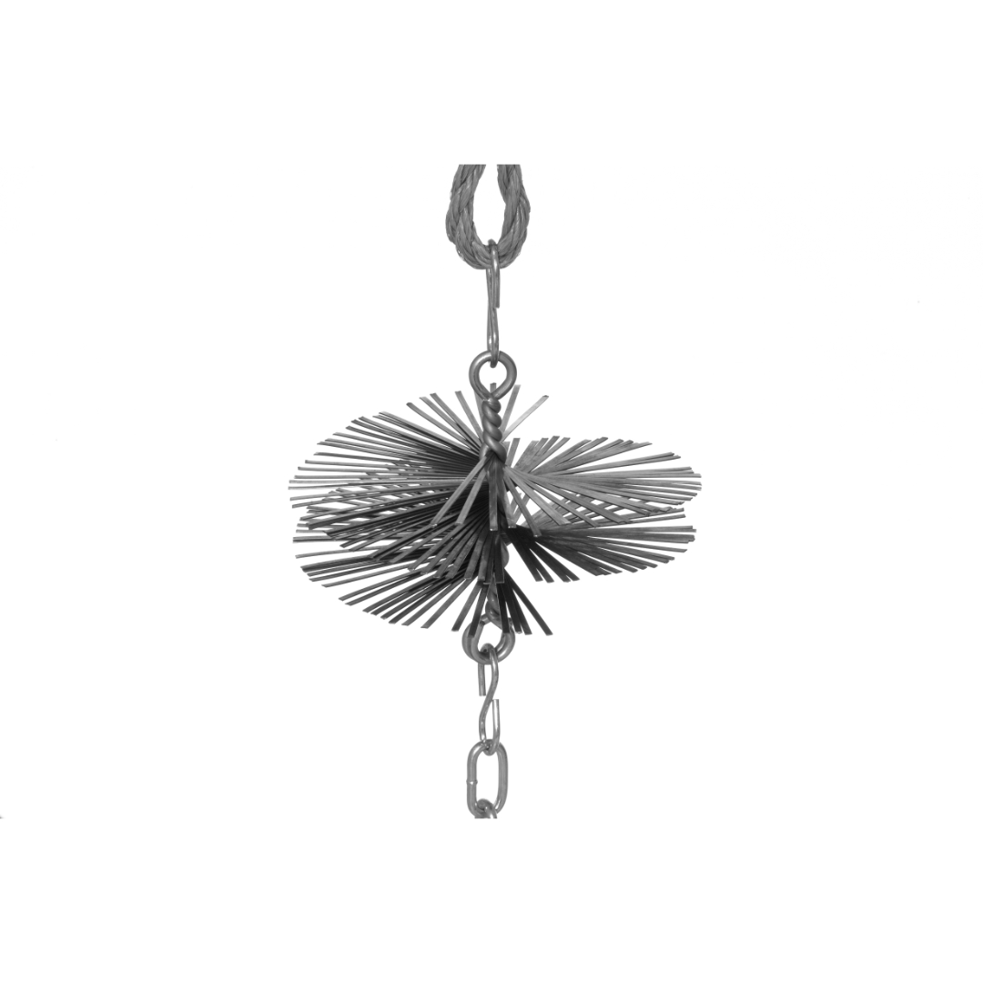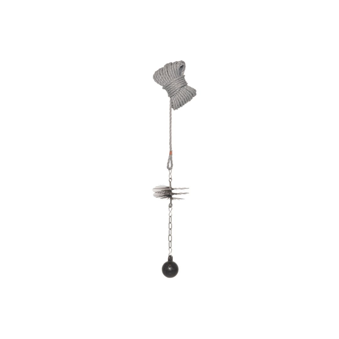 Komplett feiesett for skorstein: stålbørste 150 mm, 10 m tau og 1,4 kg stålkule for effektiv rengjøring ovenfra. Praktisk sett for periodisk vedlikehold.