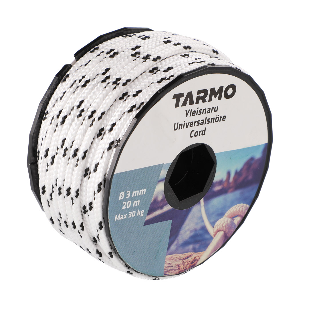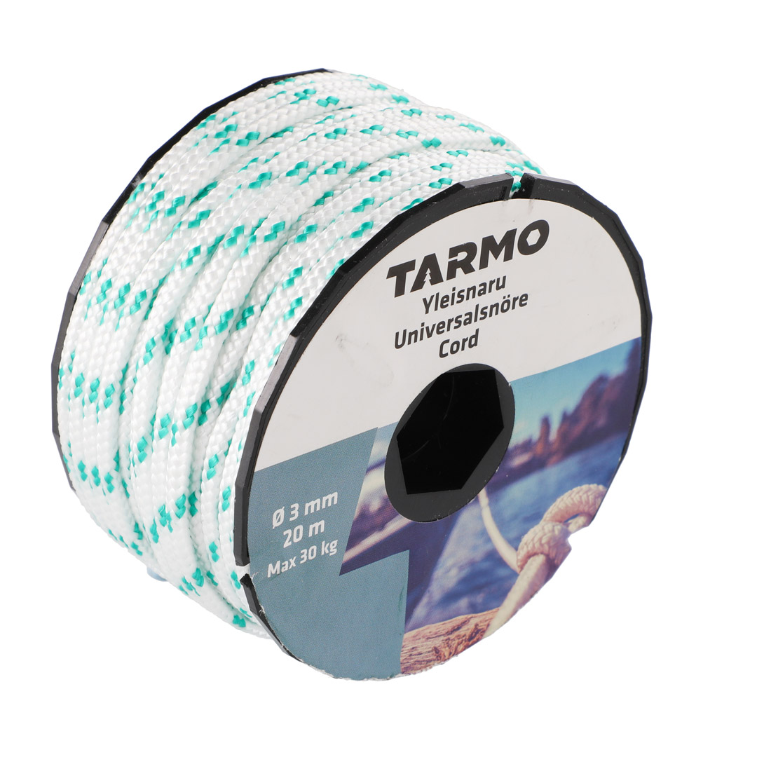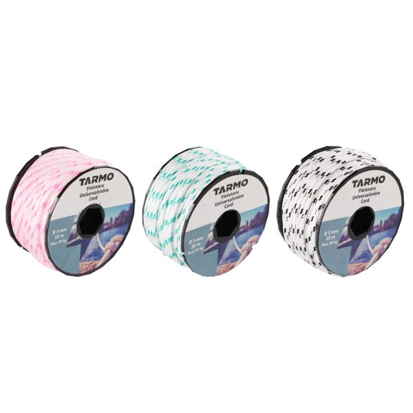 3 mm x 20 m. Assorterte farger.16-flettet universalgarn i sneller. Bruddstyrke 30 kg. Med UV-beskyttelse. Flyter. Forlengelse 26 %.