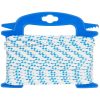 Hvitt polyestertau med blå markeringer. Bruddstyrke 500 kg. Med UV-beskyttelse. Flyter. Forlengelse 26 %. Hvit med blå spor.