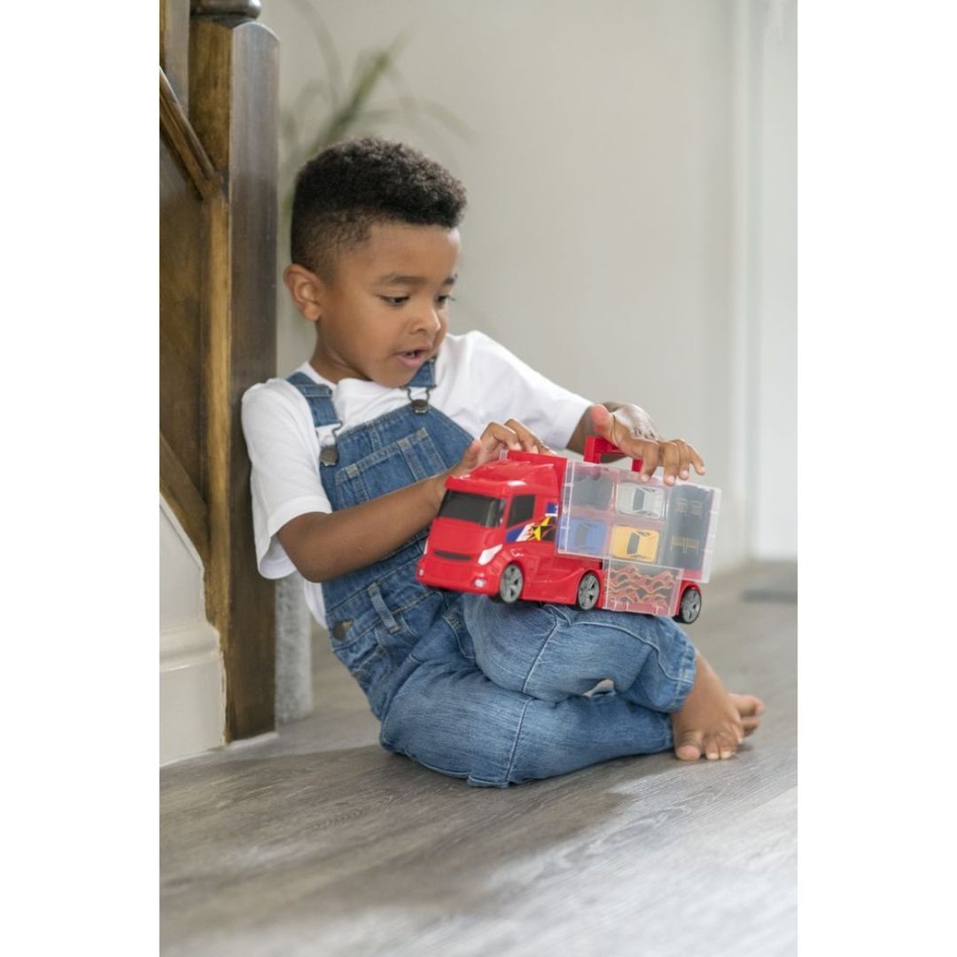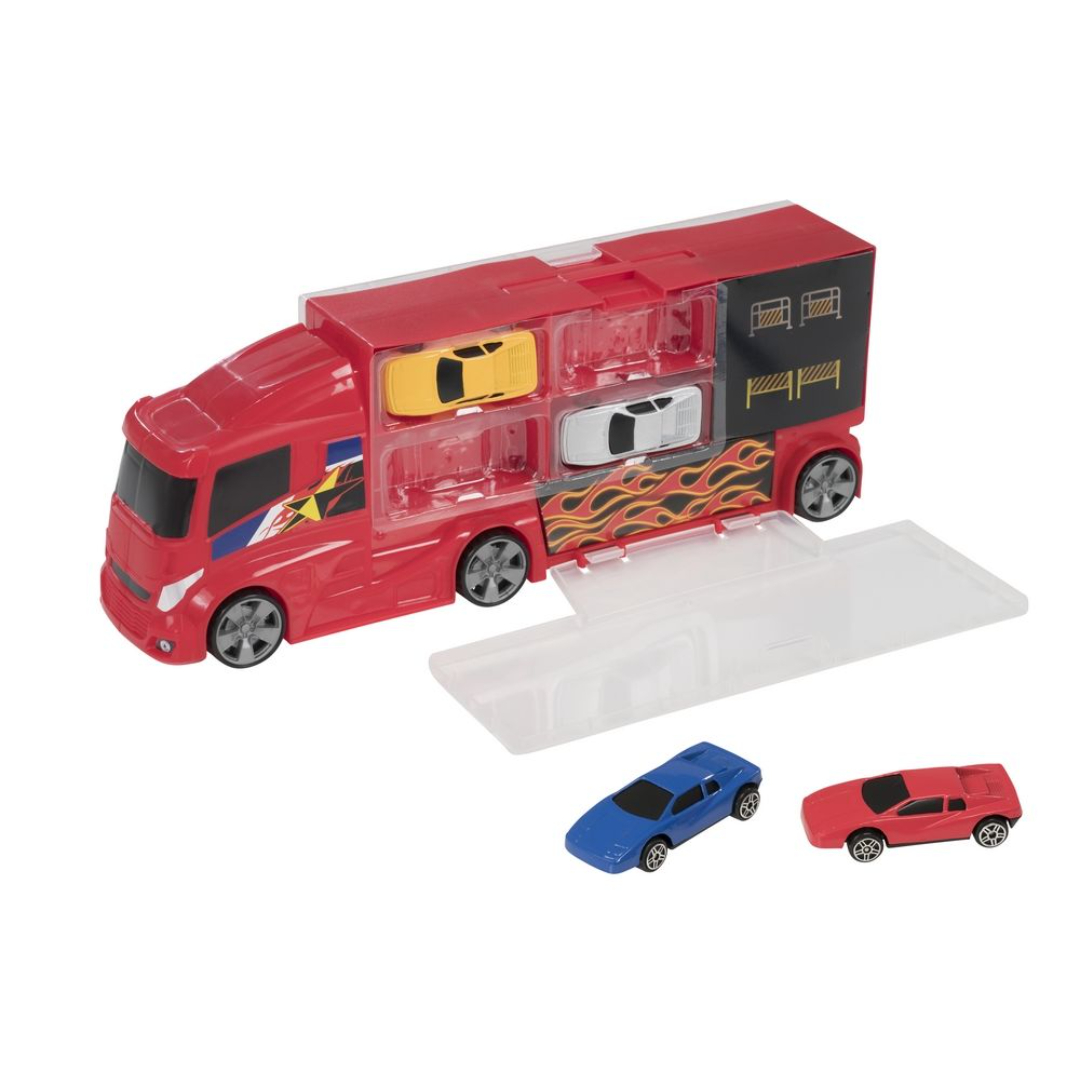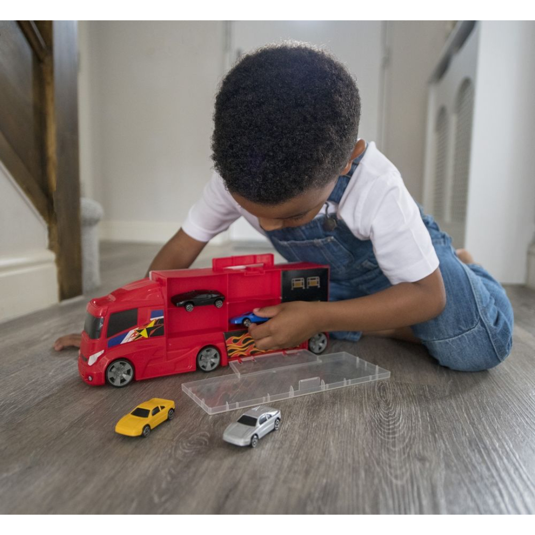 Transporter bilene dine med stil ved hjelp av Teamsterz Biltransporter. Denne 35 cm lange transporteren kommer med fire biler i ulike farger og design. Lasteplanet kan senkes for enkel av- og pålasting, og settet oppmuntrer til kreativ lek og organisering. Passer for barn fra 3 år og oppover.
