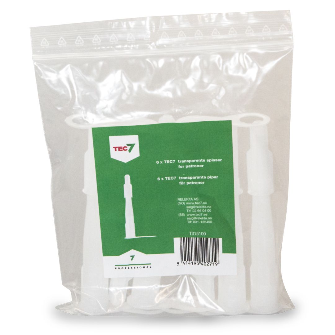 6 stk løse transparente plast patronspisser med skrukork. Patronspissene passer alle patroner i Tec7- og Relekta 101-seriene, og passer i tillegg de fleste andre typer plastpatroner (290-310 ml).